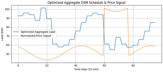 Figure 2 illustrates the optimized aggregate demand under the dynamic price signal. A clear inverse relationship between electricity price and aggregate load is observed, indicating that H-EMOS-Lite effectively shifts demand toward lower-price periods. This behavior confirms that the proposed framework successfully exploits price signals to guide coordinated demand-side scheduling.