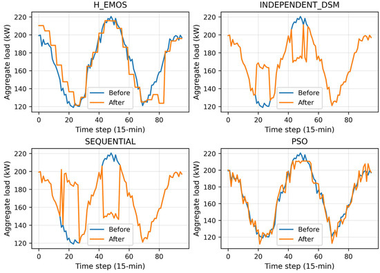 Comparison of aggregate load profiles before and after optimization using different demand-side management approaches.