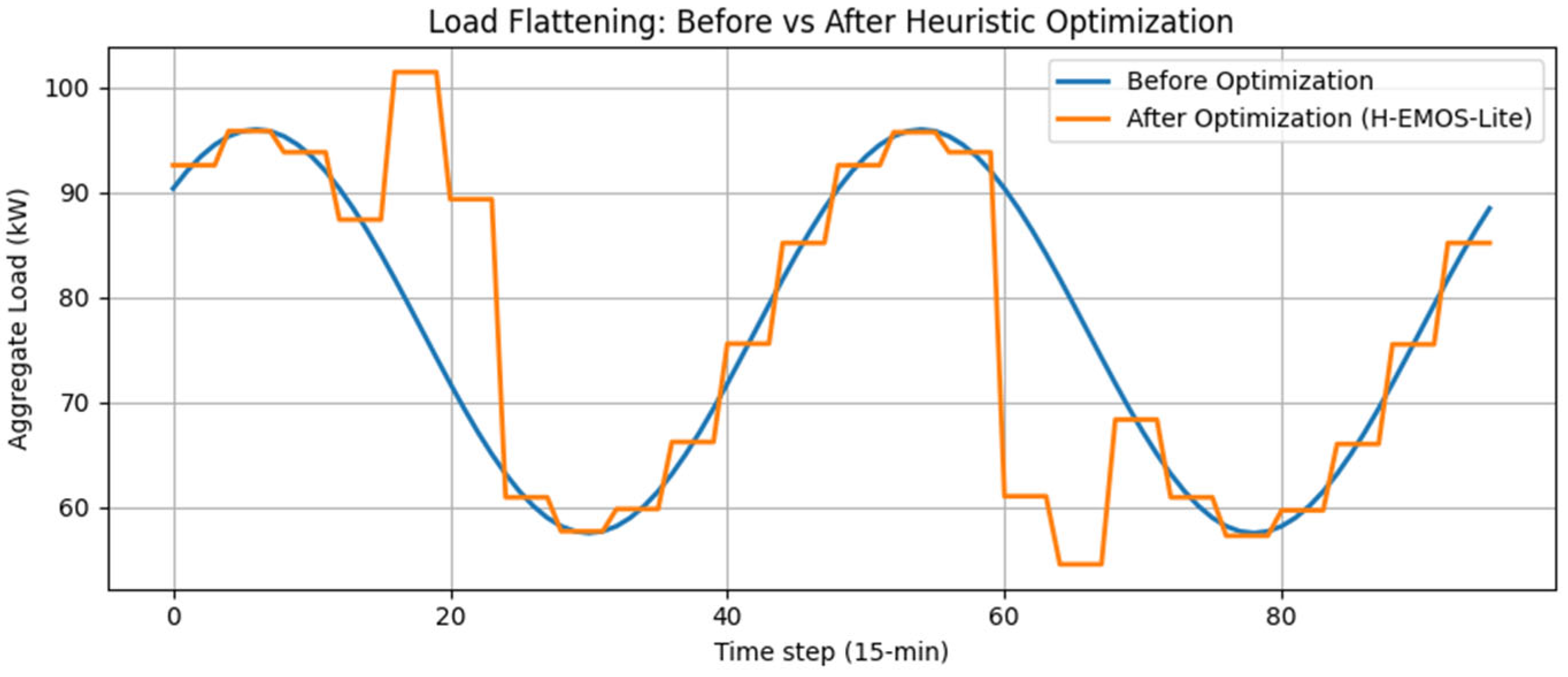 Figure 3 compares the total load before and after optimization using H-EMOS-Lite. The optimized profile exhibits reduced peak demand and a noticeably smoother temporal evolution, demonstrating the framework’s ability to flatten demand while avoiding abrupt load redistributions. This is direct evidence of how the H-EMOS-Lite algorithm helps the system keep working more smoothly at peak times without reducing service quality.