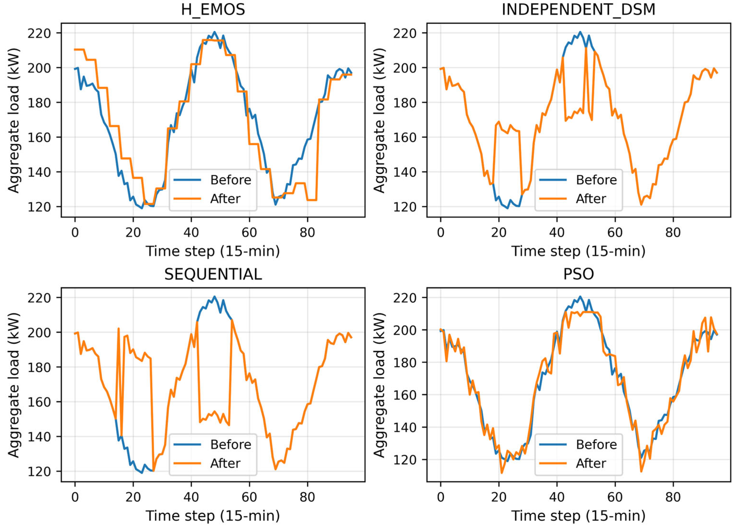 Figure 4. The proposed H-EMOS-Lite method successfully flattens the original demand curve in a gradual manner. The smoothness of the optimized load profile with gradual shifts over time suggests that shifting loads is realized in a coordinated and realistic manner. This is especially useful for practical demand-side management as sudden power fluctuations are prevented. On the other hand, the Independent DSM approach generates significant discontinuities in aggregate load profile. Sharp increases or decreases are seen at a few time steps, indicating non-coordinated actions at a household level. Although some peak shaving is achieved and the overall load appears flatter compared to the original (