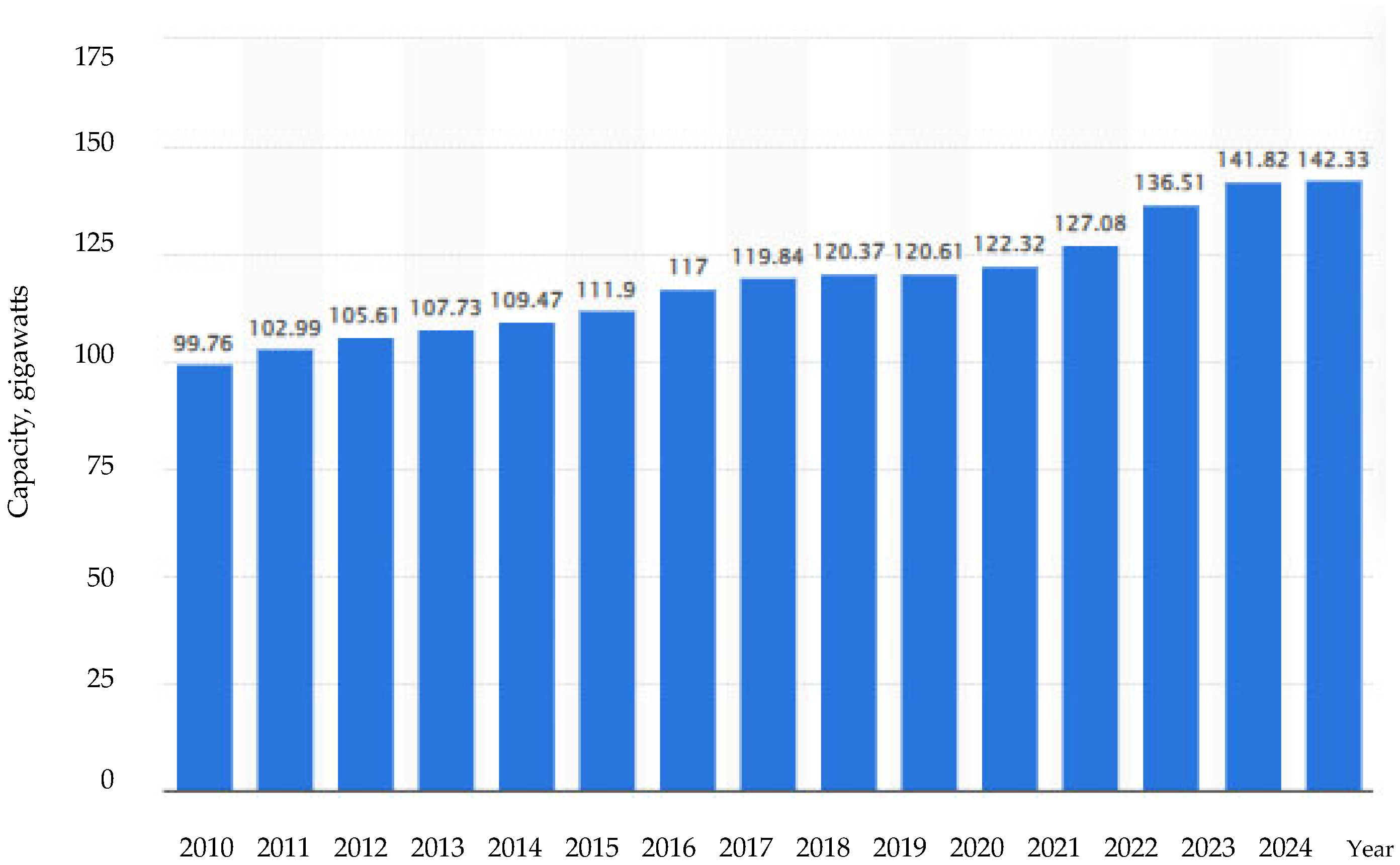 - Statista. Pure Pumped Storage Hydropower Capacity Worldwide from 2010 to 2024. 2025. Available online: https://www.statista.com/statistics/1304113/pumped-storage-hydropower-capacity-worldwide/ (accessed on 22 December 2025).