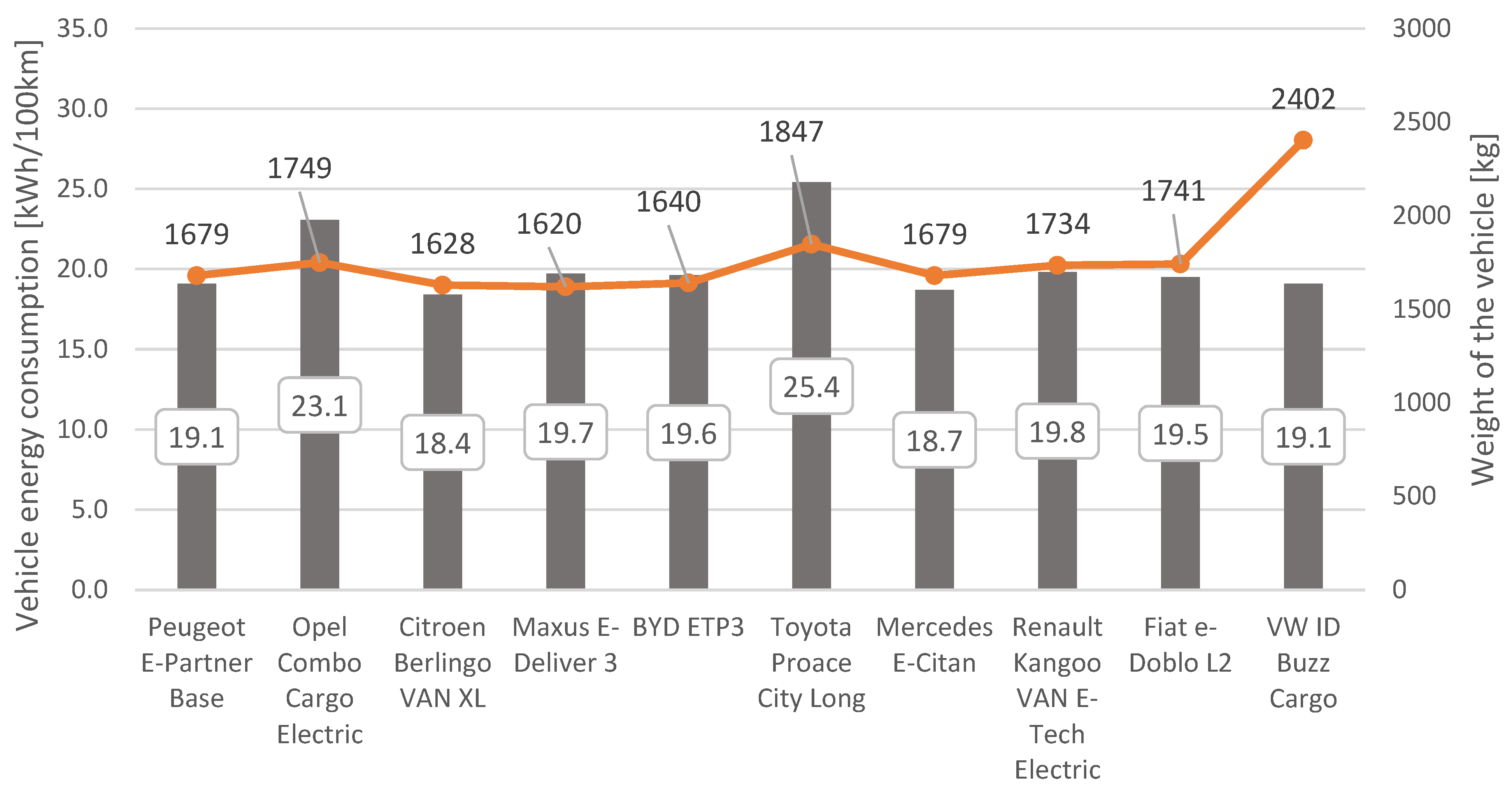 Figure 2). Energy consumption for the three heaviest vehicles is noticeably higher. The Toyota Proace City Long consumes the most energy—a whopping 24.5% more than the average.