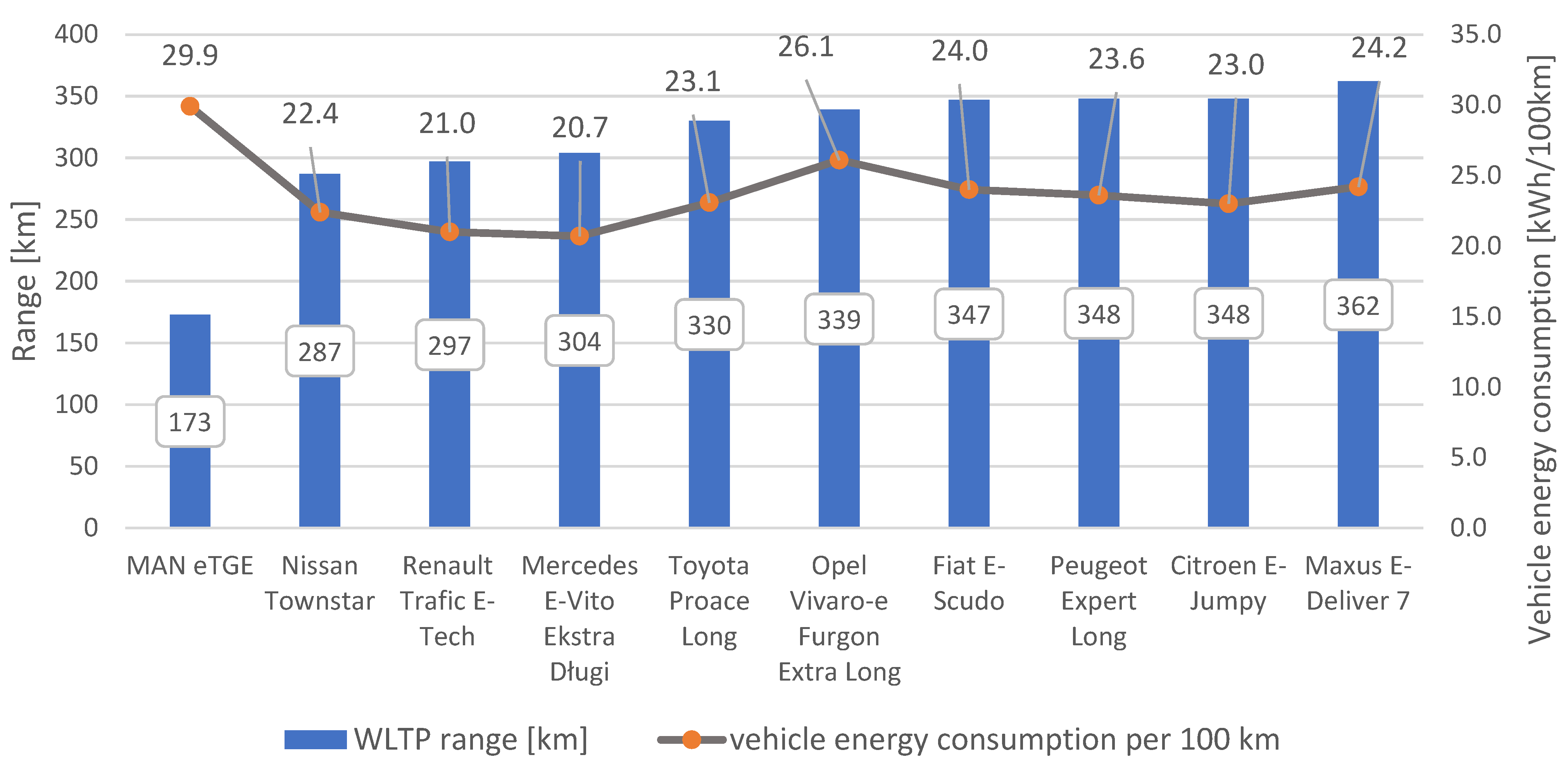 Figure 5). The WLTP range in this group ranges from 173 to 362 km, with the MAN eTGE achieving the lowest result and the Nissan e-NV200 achieving the highest. Energy consumption per 100 km ranges from 21.0 to 29.9 kWh, indicating that medium-sized vans require on average 3–5 kWh more energy per 100 km than vehicles in the smaller segment. Vehicles with the longest range are not always the most energy-efficient, suggesting that factors such as aerodynamics, payload, and drivetrain characteristics become increasingly important with larger designs. Despite their higher energy consumption, some models—such as the Fiat e-Doblo L2 and Renault Kangoo VAN E-Tech—achieve a relatively good compromise between range and energy consumption, making them competitive in their class.