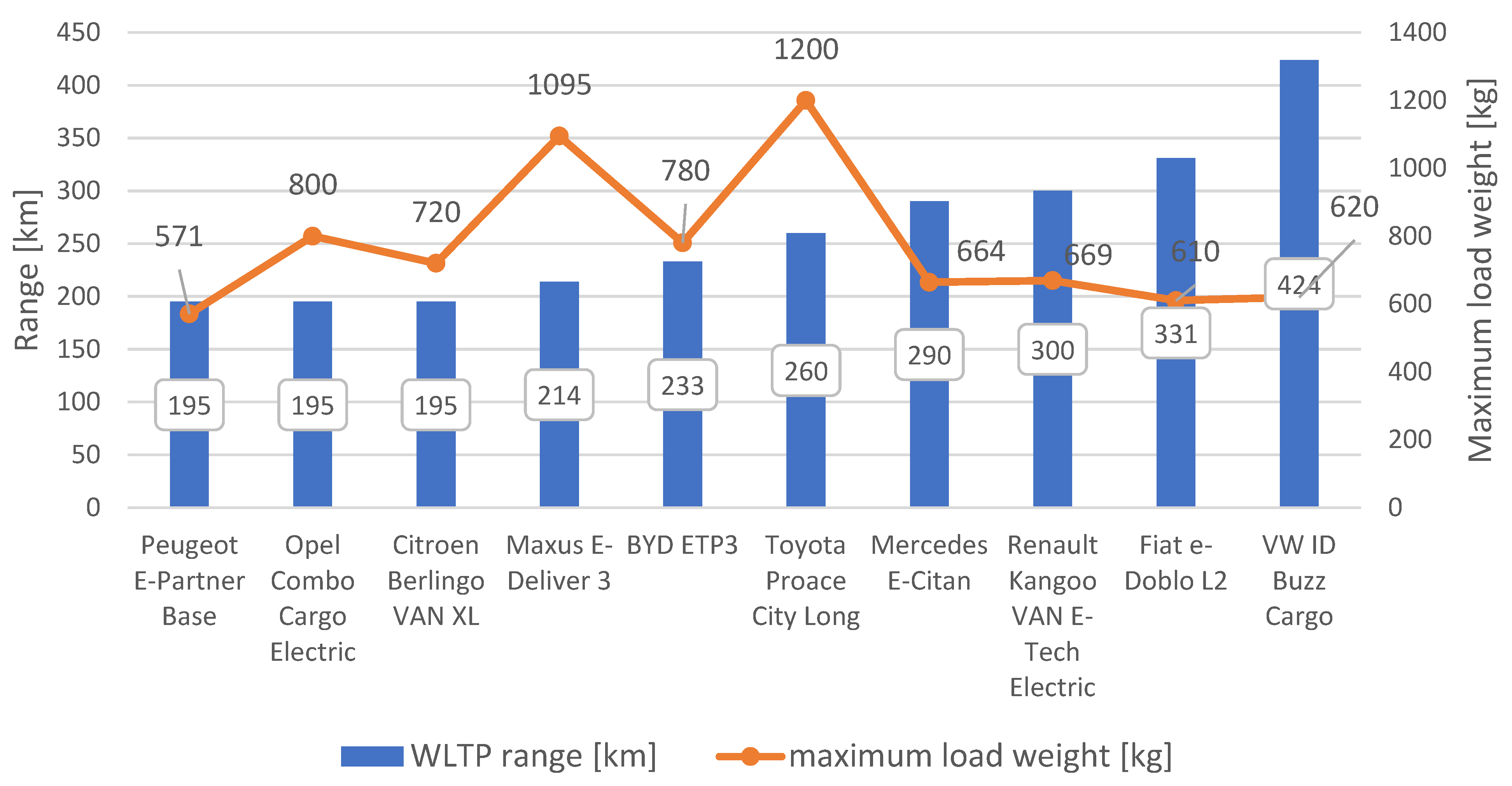Figure 5), it is noticeable that WLTP range values range from approximately 195 to 480 km. The VW ID Buzz Cargo achieves the longest range (480 km), while the Peugeot e-Partner achieves the shortest (195 km). At the same time, charging times using alternating current (AC) range between 330 and 510 min, with the highest values observed for vehicles with larger battery capacity, such as the VW ID Buzz Cargo and Opel Combo-e Cargo (