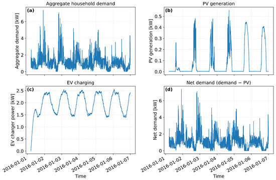 Representative high-resolution time-series example from the 2016 dataset (January–July): (a) aggregate household demand; (b) PV generation; (c) EV charging load; and (d) net demand defined as .