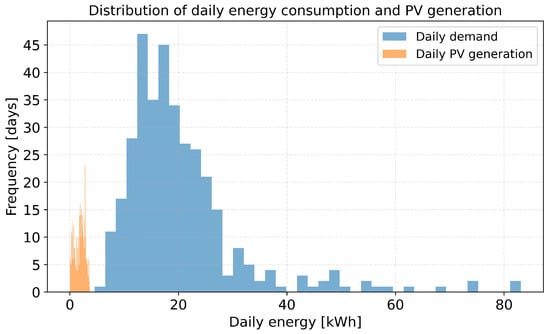 The PV system represented in the dataset operates in a grid-connected mode without dedicated local energy storage or auxiliary generation sources. As a result, PV generation does not closely align with the household load curve and is generally insufficient to fully meet residential demand at all times. Excess generation is exported to the grid when available, while deficits are covered through grid imports. This operational context explains the temporal mismatch between demand and generation profiles observed in Figure 2. To avoid visual overcrowding and facilitate interpretation, daily aggregated energy quantities are analysed statistically rather than relying on a single dense multi-month plot. The distributions in Figure 2 summarise daily household consumption and PV generation over the full year, enabling assessment of their statistical characteristics without obscuring short-term operating behaviour.