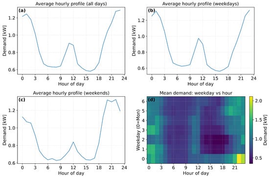 Diurnal demand behaviour: (a) all days; (b) weekdays; (c) weekends; (d) weekday-hour interaction heatmap.