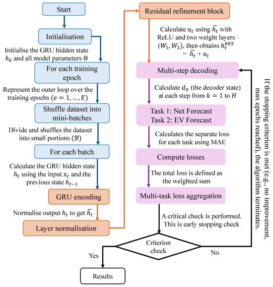 The pseudocode in Algorithm 1 summarises the full training workflow of the proposed RN-MTGRU architecture and highlights how each component addresses the modelling challenges formulated in the research questions. The process begins with GRU-based temporal encoding, which extracts sequential structure from multivariate input features and provides a shared temporal backbone for joint forecasting (RQ1). The encoded state is subsequently normalised, a step designed to stabilise hidden dynamics in response to the pronounced temporal distribution shifts observed in residential energy data, thereby directly addressing the need for improved robustness under non-stationary conditions (RQ2). A residual refinement block is then applied, enabling the model to adjust its hidden representation locally so that fast changes, such as EV plug-in events or short-lived demand spikes, are not smoothed out. This mechanism strengthens the model’s responsiveness to high-frequency dynamics, which is central to both RQ2 and achieving accurate short-horizon forecasts relevant for real-time DR (RQ3). The refined representation is passed through a multi-step decoder that produces parallel predictions for net load and EV charging, thereby operationalising the multi-task coupling central to RQ1. Training proceeds end-to-end using a weighted multi-task loss that links the two outputs and encourages the model to exploit shared patterns across them. The iterative optimisation of GRU, normalisation, residual, and task-specific parameters results in a unified forecasting pipeline capable of modelling the intertwined temporal behaviour of modern residential MGs. Overall, the algorithm integrates stability, responsiveness, and multi-task structure in a manner directly aligned with the three research questions guiding this study.