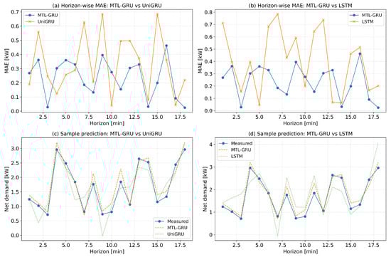 The comparative benchmarking analysis in this subsection provides formal validation of the proposed RN-MTGRU against well-established forecasting approaches. The UniGRU and LSTM models represent standard recurrent architectures widely adopted for residential load forecasting, while the persistence model provides a lower-bound reference commonly used in operational studies. All models are trained and evaluated on identical real-world datasets using the same forecasting horizons and error metrics, ensuring a fair and reproducible comparison. To evaluate the benefits of multi-task learning and residual normalisation, the RN-MTGRU is compared against a UniGRU model (single-task GRU) and a classical LSTM. The horizon-wise MAE curves for these models are shown in Figure 10.