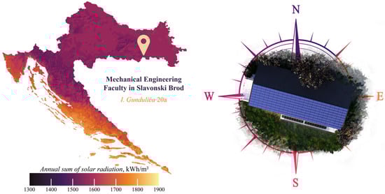 Due to its favorable location and south orientation (Figure 3), the Mechanical Engineering Faculty in Slavonski Brod is well suited for such a system, with annual solar irradiation of 1500–1600 kWh/m2. Coastal Adriatic cities show even higher values, reaching 1700–1900 kWh/m2.