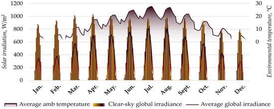 According to meteorological data from the European Commission’s Photovoltaic Geographical Information System (PVGIS) [55], all necessary parameters for the system analysis were obtained. The average monthly values of solar irradiation and ambient temperature for a representative year, based on data collected between 2005 and 2025, are presented in the diagram shown in Figure 4.