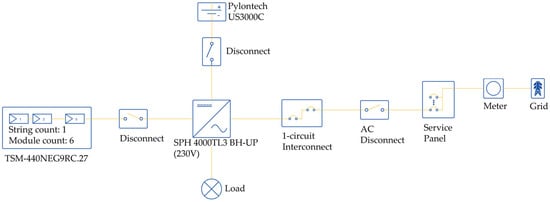 To provide a schematic diagram of the PV system configuration, Figure 5 and Figure 6 presents a schematics of the system with its main components.
