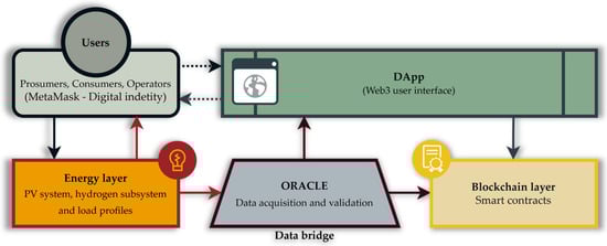Users are classified into three groups: prosumers (producer–consumers), consumers and optionally an operator or community entity responsible for system supervision. Each user’s identity is linked to their blockchain address, while access rules can be further defined within permissioned blockchain networks. This approach ensures transparency and equality among participants, with the operator’s role limited to coordination rather than centralized control.