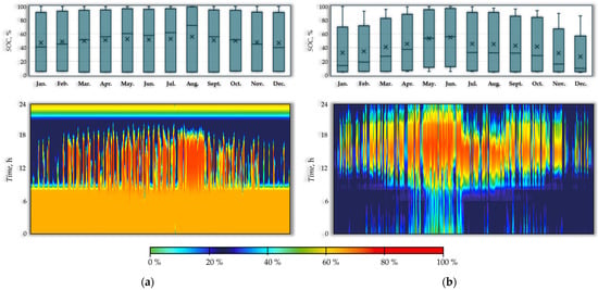 In this model, Ebatt denotes the nominal energy capacity of the battery (kWh), ηc and ηd represent the charging and discharging efficiencies and Δt is the simulation time step (1 h). The overall round-trip efficiency, ηrt = ηc ∙ ηd, typically ranges from 0.85 to 0.95 depending on the electrochemical technology. DC–AC conversion losses are accounted for through the system loss factor fsys and inverter efficiency described in Section 2.1.