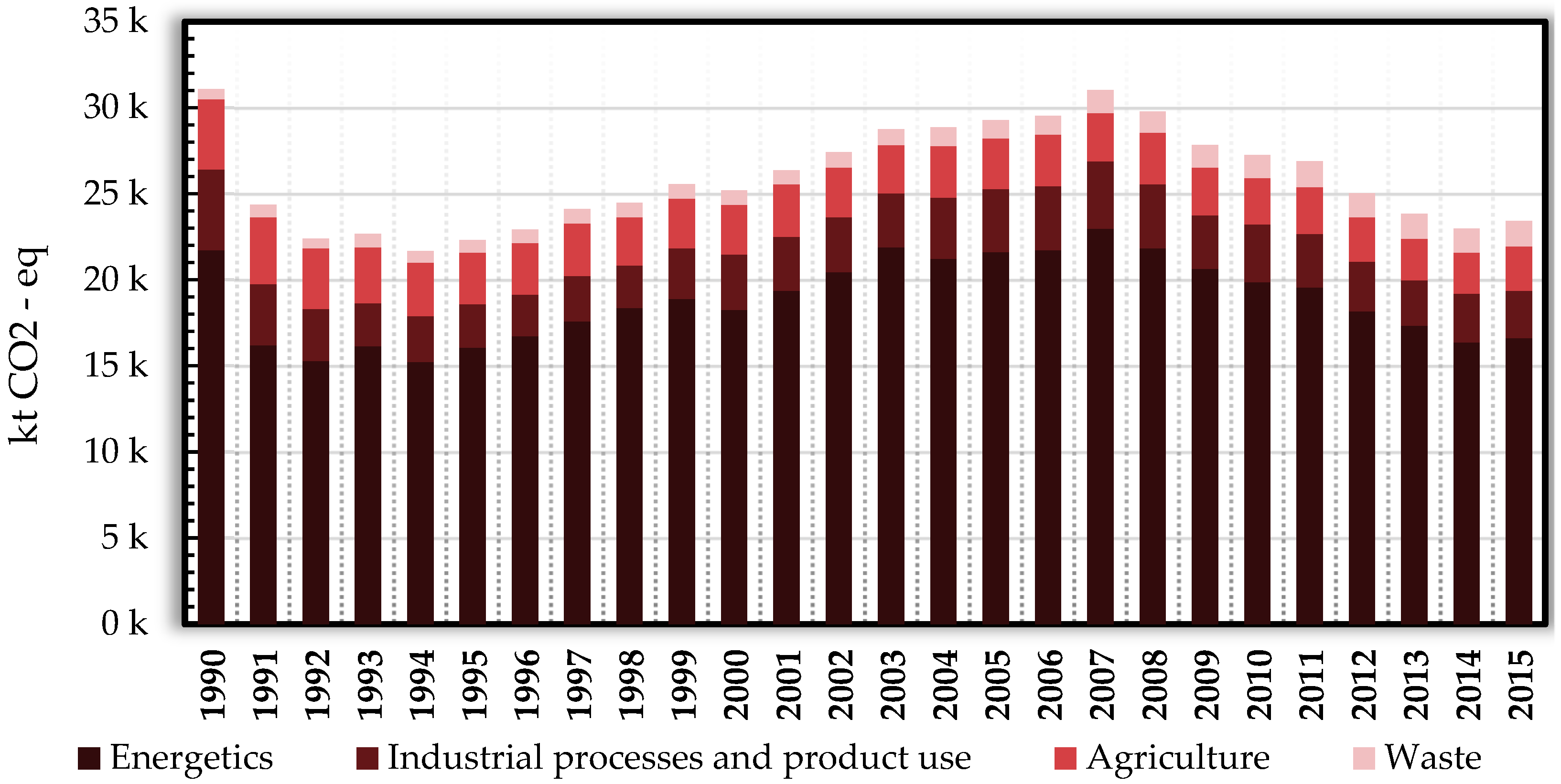 The rise in renewable energy use suggests a decline in greenhouse gas emissions. However, the 2008–2014 reduction mainly resulted from the economic crisis. Croatia met its Kyoto targets and, after joining the EU, adopted a 20% reduction goal by 2020 and 40% by 2030 under the Paris Agreement.