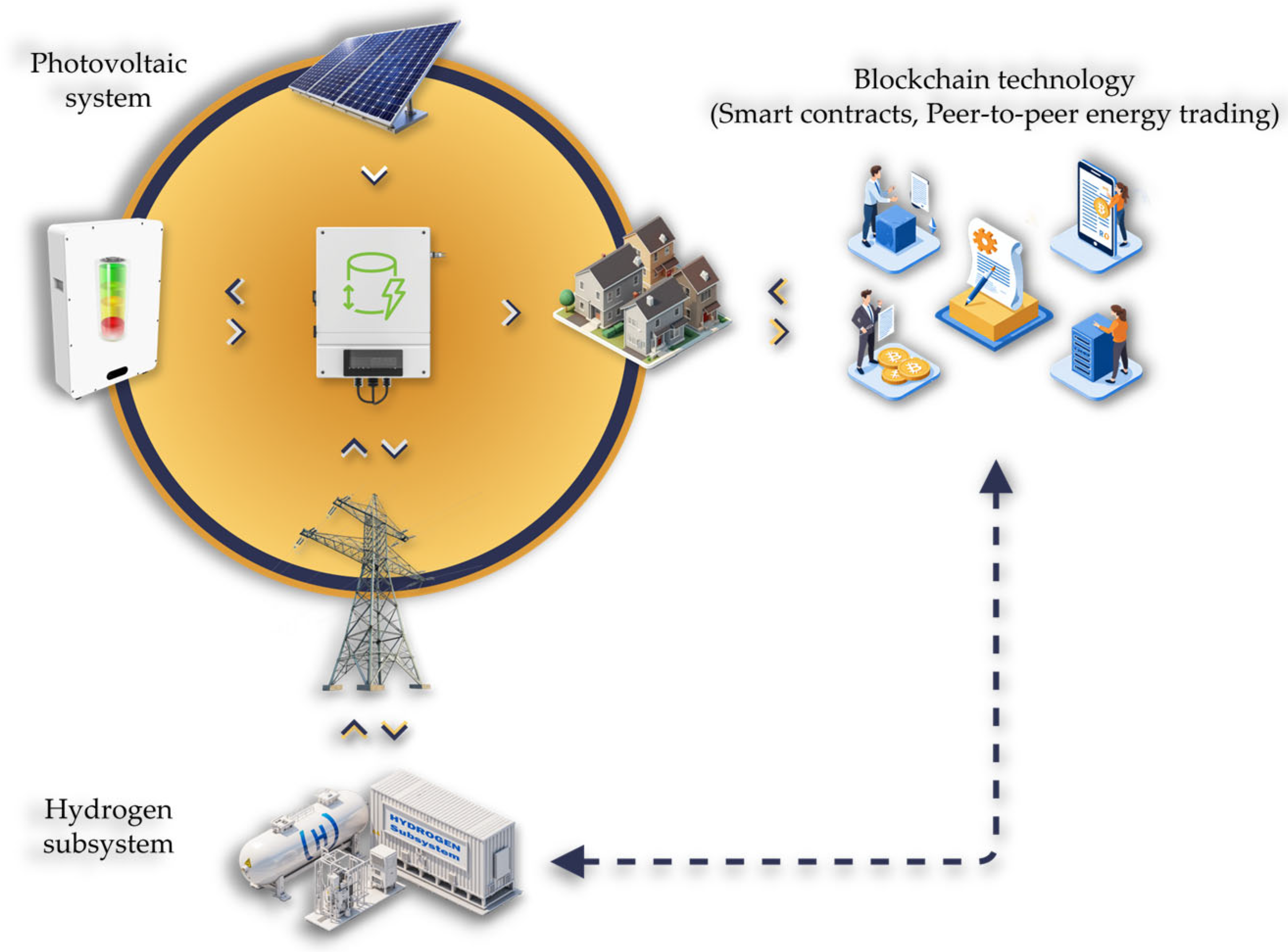 52]. Recent advances in virtual power plant (VPP) concepts demonstrate how distributed PV, battery and hydrogen systems can be coordinated under unified digital control, with blockchain serving as the settlement and trust layer for multi-actor coordination in net-zero energy networks [