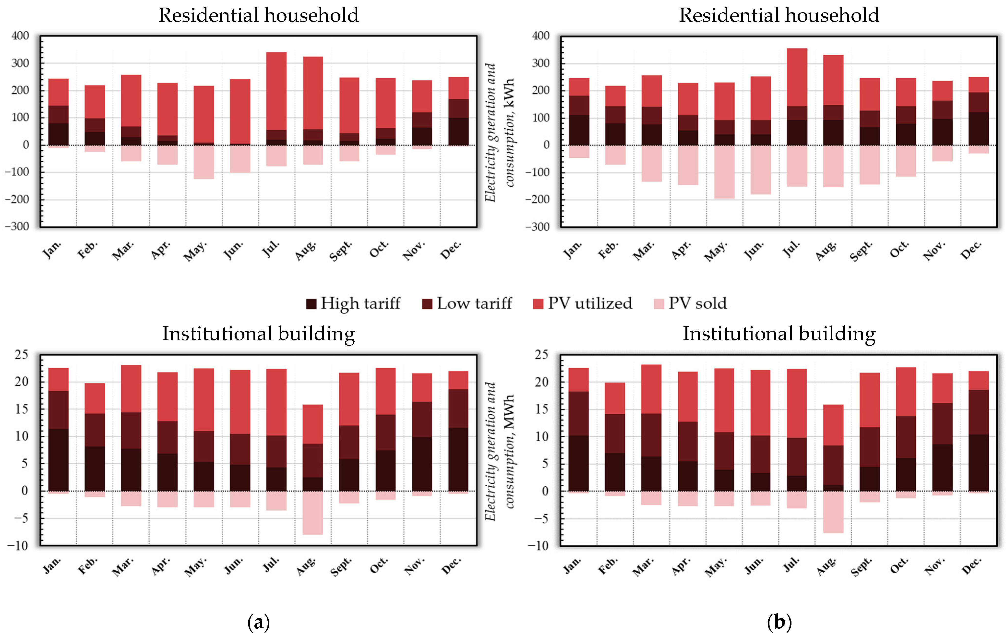 Monthly electricity profiles exhibit pronounced seasonal variability caused by the temporal mismatch between photovoltaic generation and electricity demand. Battery storage mitigates this mismatch by increasing on-site utilization of generated electricity, thereby reducing grid dependency and surplus energy export. This effect is more pronounced in residential systems, where closer alignment between photovoltaic production and household demand leads to a higher relative reduction in grid electricity purchases. In contrast, institutional buildings already benefit from strong daytime load alignment with photovoltaic generation, resulting in a smaller relative impact of battery storage on surplus reduction, while still improving overall energy self-sufficiency.