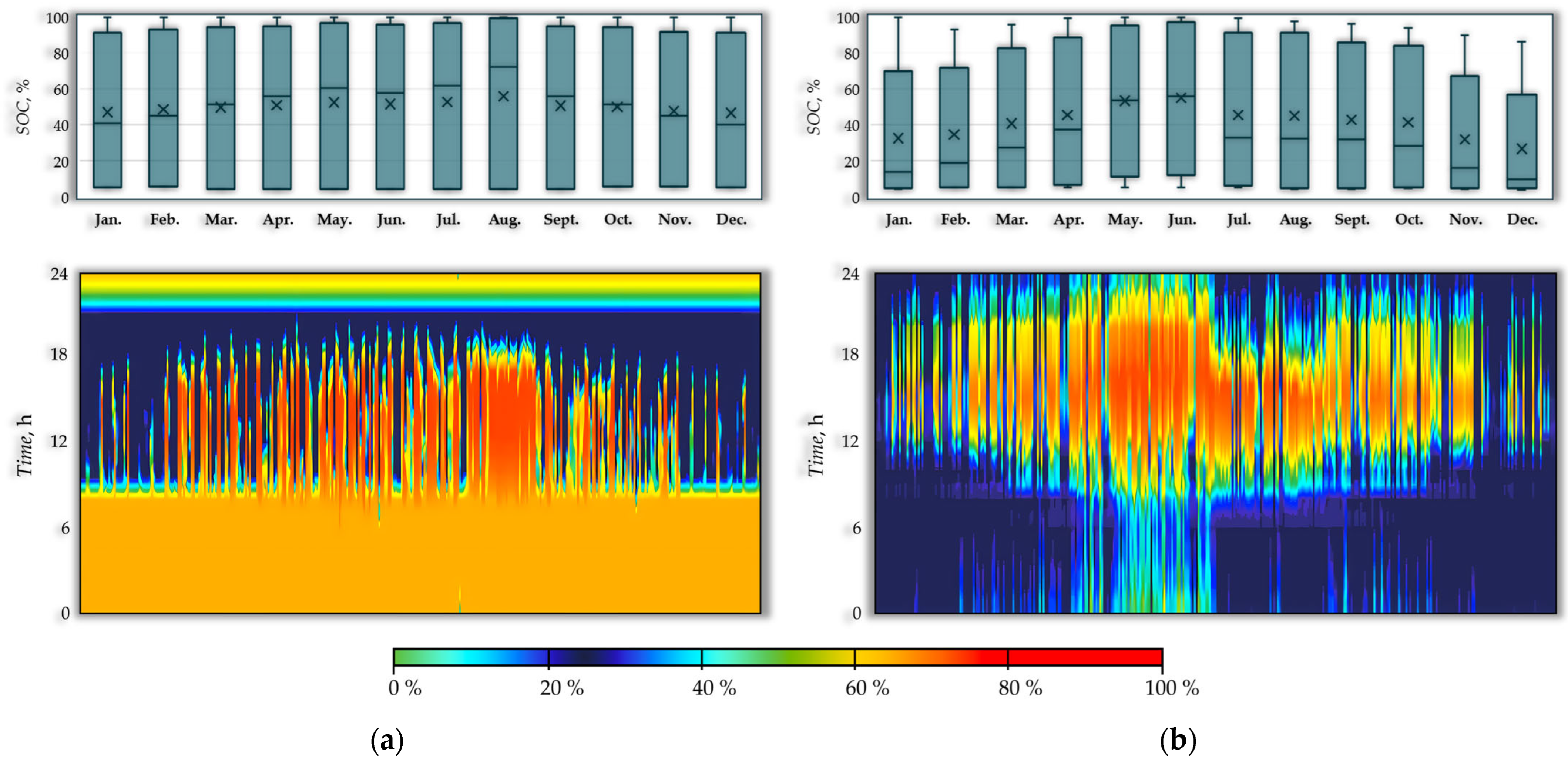 Differences in battery utilization are primarily governed by system scale and load characteristics. Institutional buildings exhibit higher and more continuous daytime electricity demand, leading to frequent battery cycling during periods of high photovoltaic generation. Conversely, lower cycling intensity in the residential case reflects a mismatch between available photovoltaic surplus and installed battery capacity, indicating potential for improved utilization with increased photovoltaic capacity. Overall, the observed state-of-charge dynamics confirm the role of battery storage in enhancing self-sufficiency and supporting peak-load management under variable generation and demand conditions.