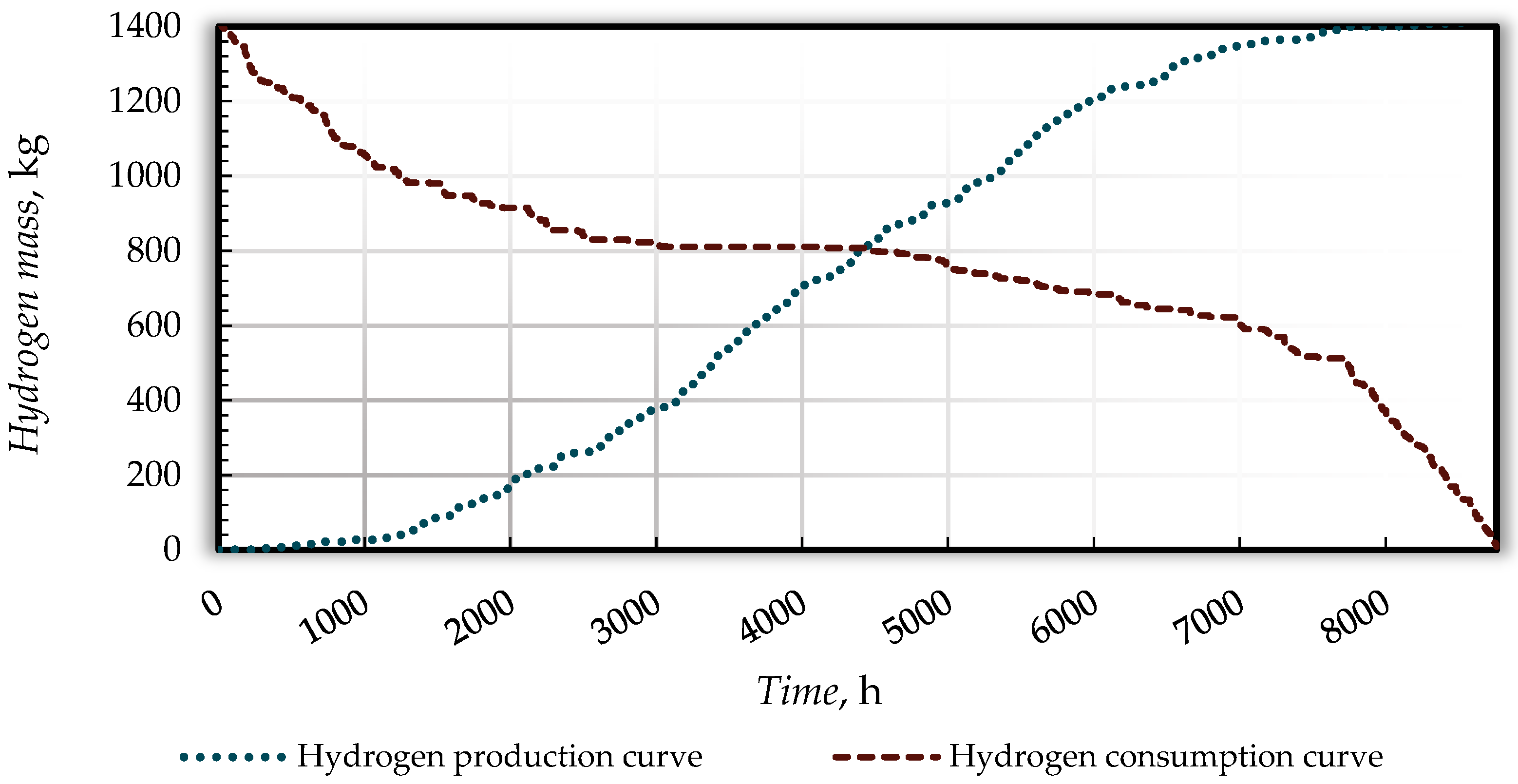 The mass of hydrogen in the storage tank evolves discretely according to the following relationship:
