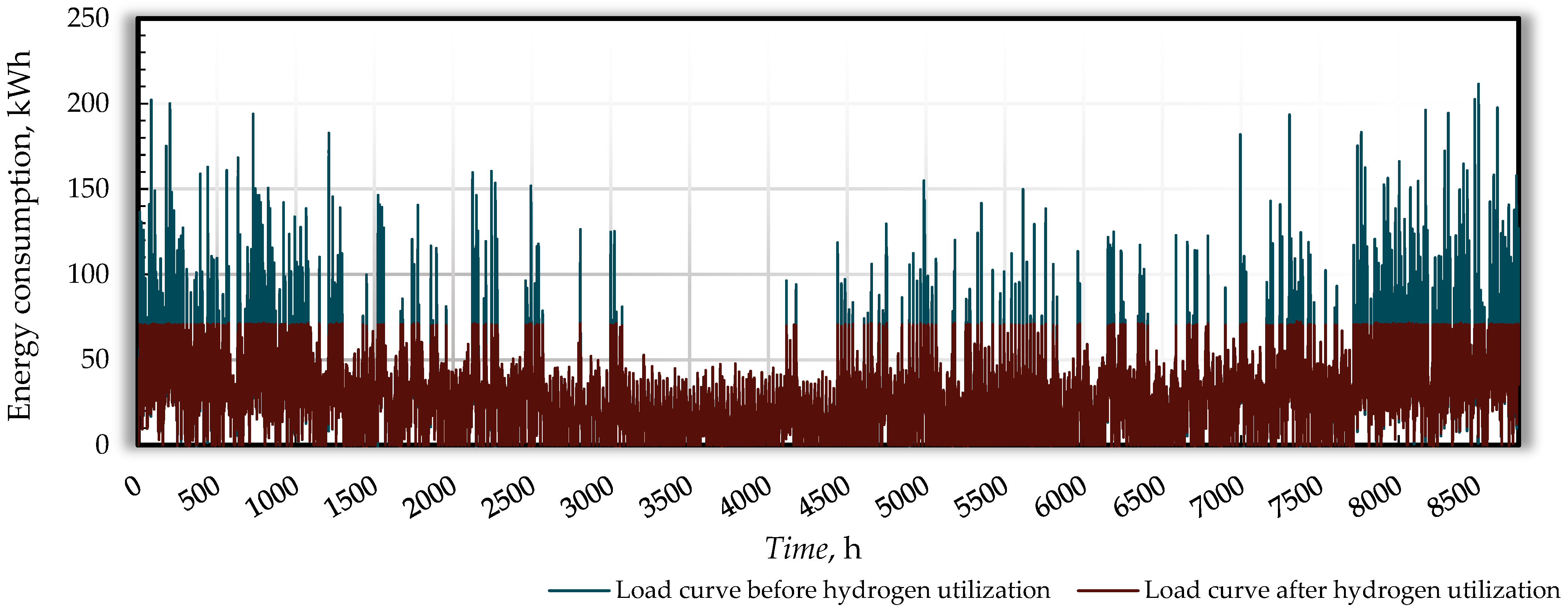 Operationally, in the peak-shaving scenarios, a target maximum grid power Pmax is defined and the fuel cell energy output EFC,t is dispatched such that maxt (Pload,t − EFC,t) ≤ Pmax, subject to the available hydrogen storage Mt. This approach was applied in the practical case study, where operational decisions were made based on the difference between the instantaneous peak demand and the predefined target level.