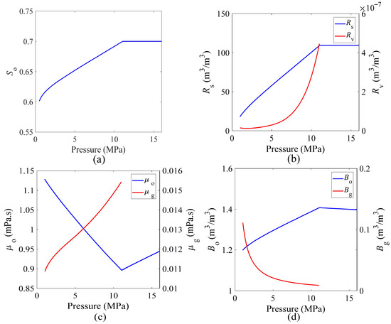 PVT properties of oil and gas. (a) Saturation–pressure relationship from CVD. (b) Solution gas–oil ratio and solution oil–gas ratio profiles. (c) Oil and gas viscosity profiles. (d) Oil and gas volume factor profiles.
