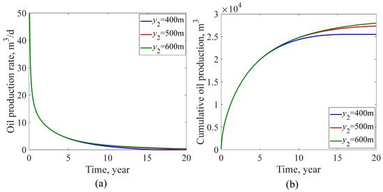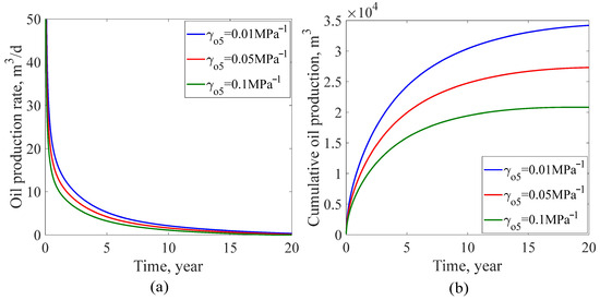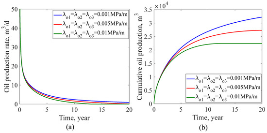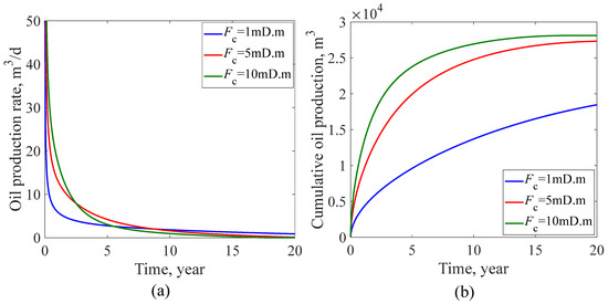 Figure 5 depicts the effect of the permeability modulus of the main fracture () on the oil production rate and cumulative oil production. As shown in Figure 5, the permeability modulus of the main fracture has a notable influence on both the oil production rate and cumulative oil production. Over time, the oil production rate declines sharply at first, after which the rate of decline slows; similarly, cumulative oil production increases rapidly initially and then more gradually. Furthermore, a higher permeability modulus results in a marked reduction in both the oil production rate and cumulative oil production. This is because an increased permeability modulus causes a rapid decline in the permeability of the main fracture, which results in a substantial reduction in oil production.