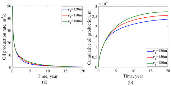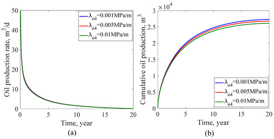 Figure 6 illustrates the effect of the threshold pressure gradient of the main fracture () on the oil production rate and cumulative oil production. As shown in Figure 6, increasing the threshold pressure gradient leads to reductions in both the oil production rate and cumulative oil production. As the threshold pressure gradient increases, the oil production rate reaches zero at an earlier stage. This is because an increased threshold pressure gradient enhances the fluid’s seepage resistance, leading to a reduction in the oil production rate. A higher threshold pressure gradient results in an earlier onset of conditions where the pressure difference falls below the threshold required for flow, thereby causing the oil production rate to reach zero at an earlier time.