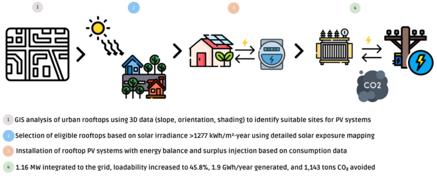 A geospatial identification of all urban parcels and residential rooftops within the study area was first performed. Each parcel was assessed based on geometry, rooftop surface availability, and proximity to the existing medium-voltage overhead and underground distribution networks.