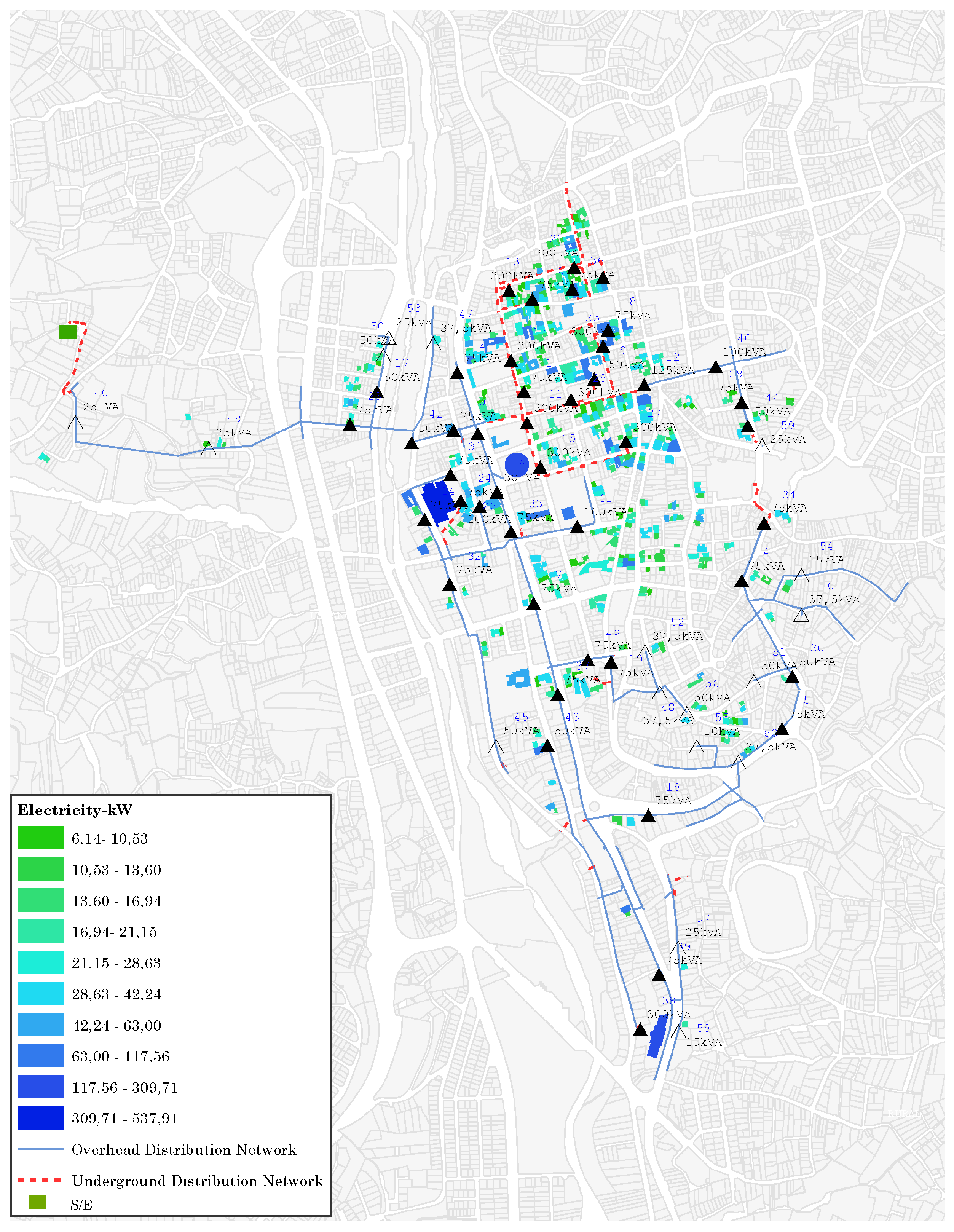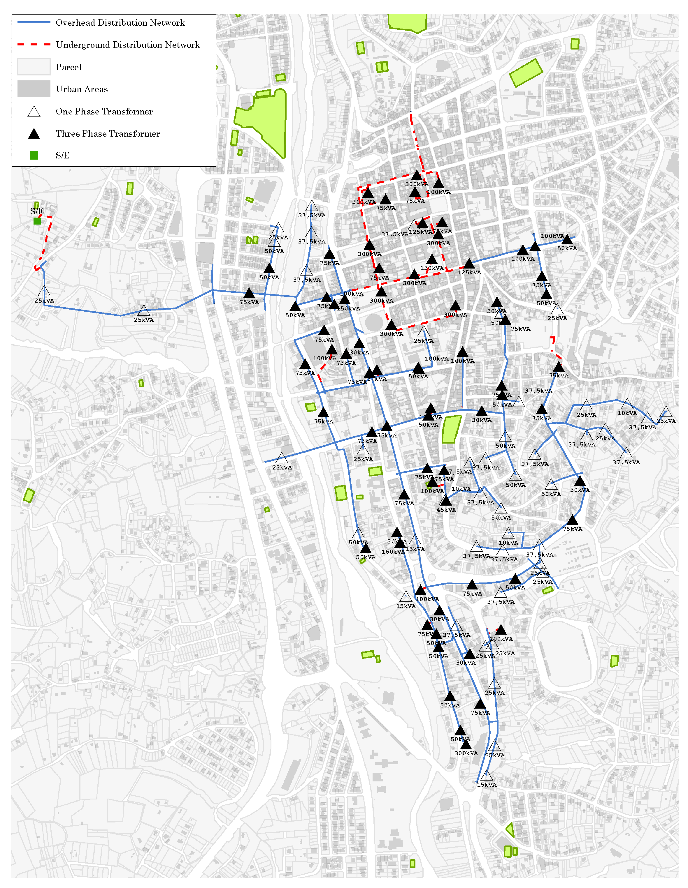 Figure 3 illustrates the spatial overlay of urban parcels, electrical distribution networks, and transformer locations.