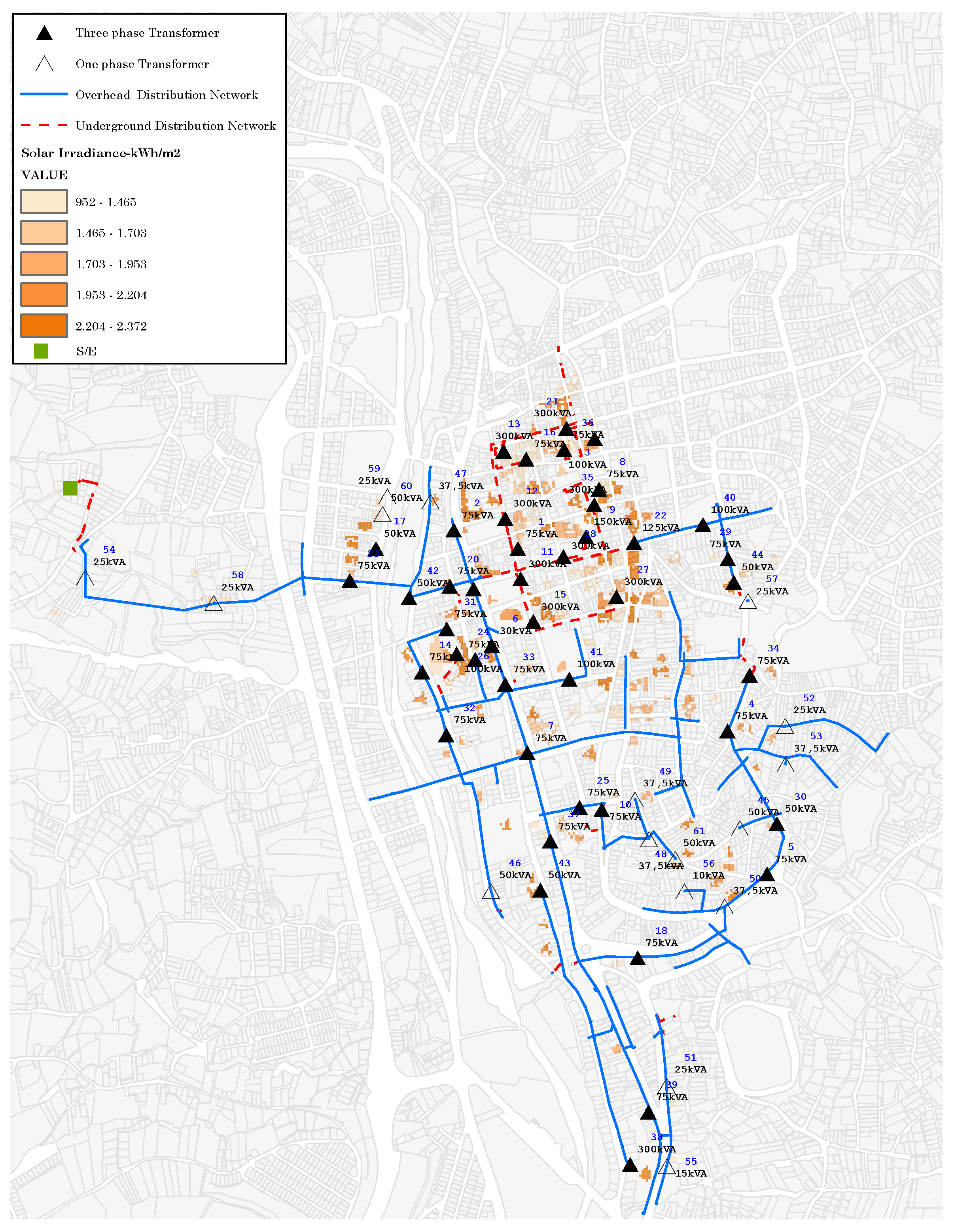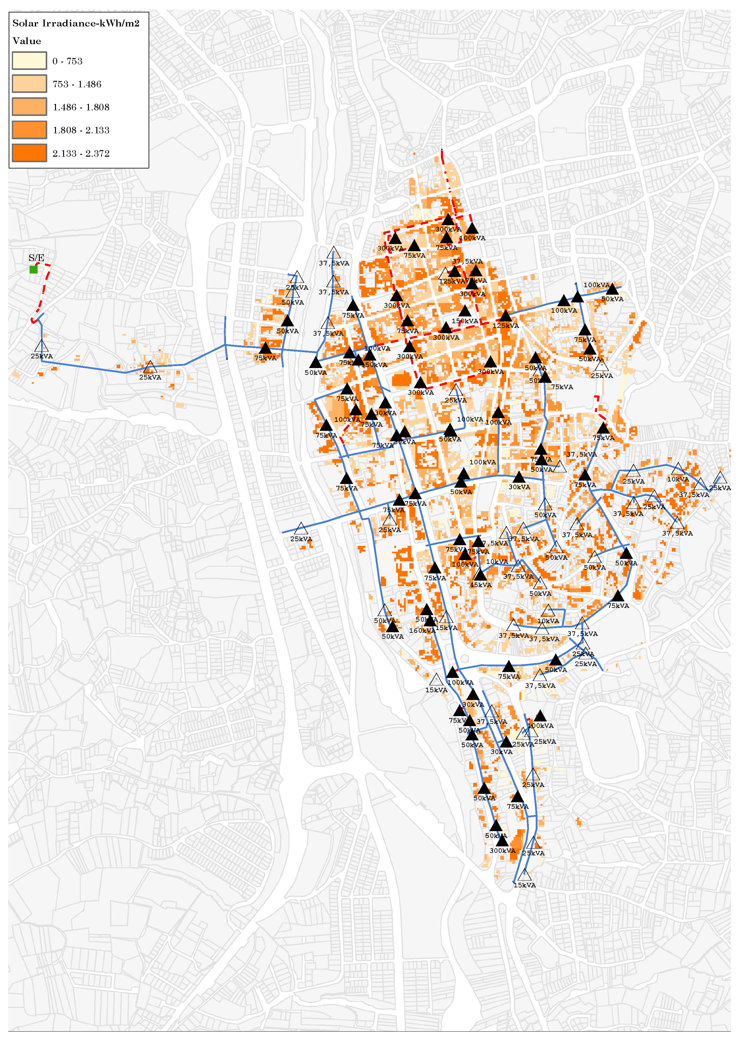 To address these gaps, this study proposes an integrated GIS-based framework that couples high-resolution solar potential analysis with electricity consumption and network data. The main contributions are as follows:
