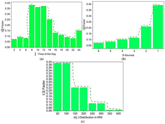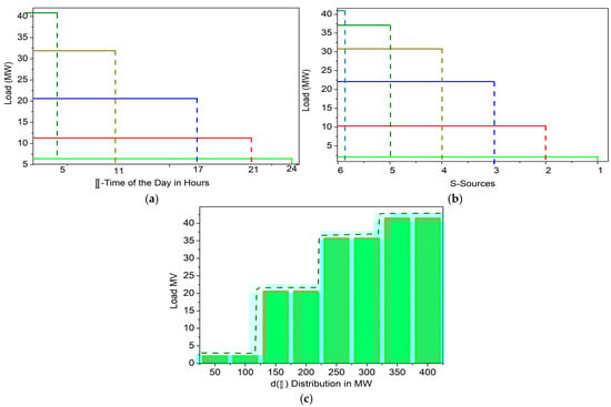 From the graph assessment, the representation in Figure 2b,c define the source-based validation of . The representations in Figure 2d,e define the assessments. Therefore, the final representation is the combination of both cases, that is, vice versa, as per (or) . The verification of an appropriate recommendation for or is based on the load duration curve. This curve estimation defines the of the to satisfy the conditions in Equation (4) series. Based on the data provided in the problem-defining section, the load variation curve is computed as shown in Figure 3a–c.
