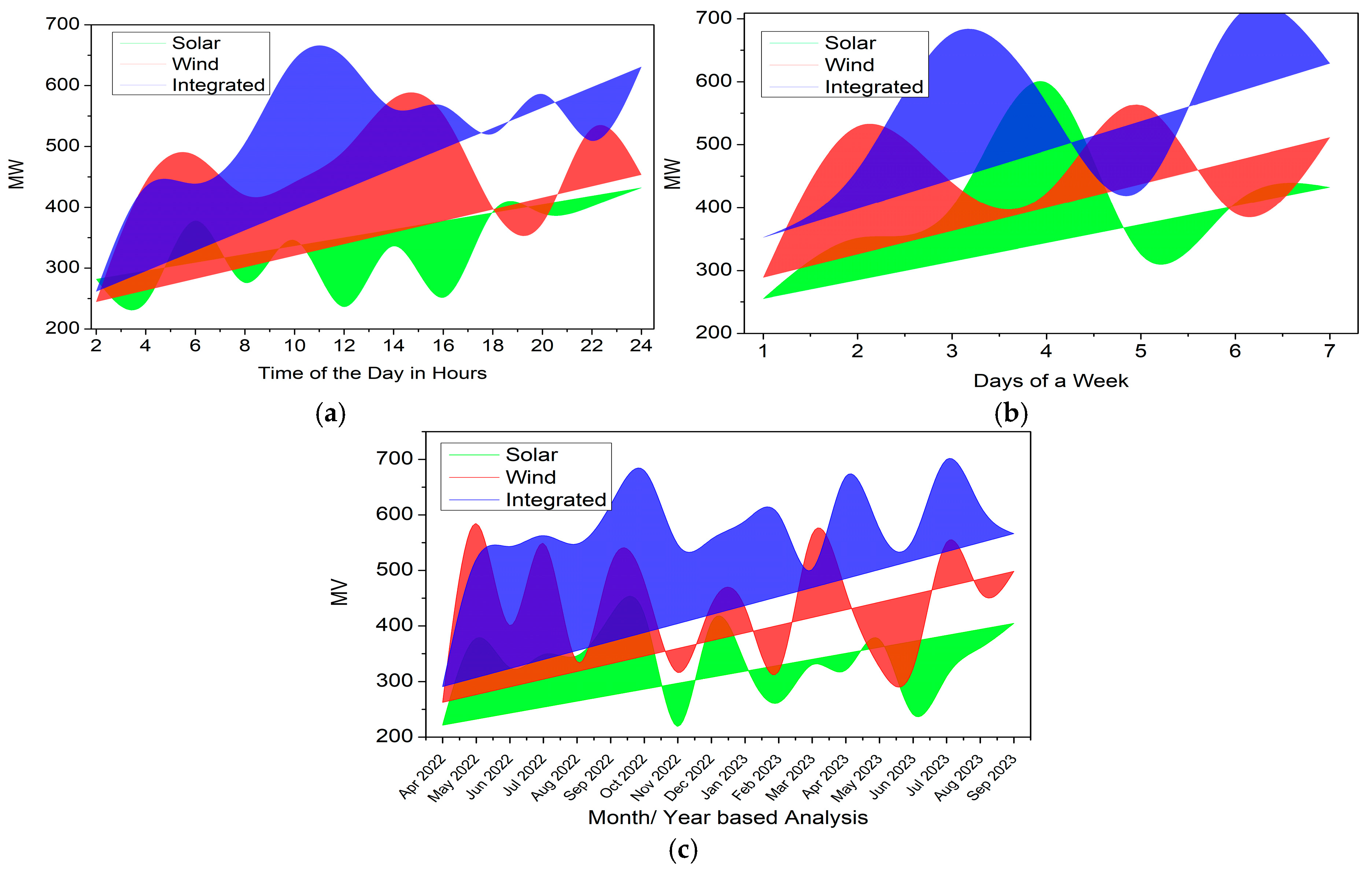 30]. Thus, the first is the power generation output analyzed for different sources, averaged over 24 h and a consecutive 7 days. In this analysis, the integration of solar and wind sources is also considered. The study is presented in
