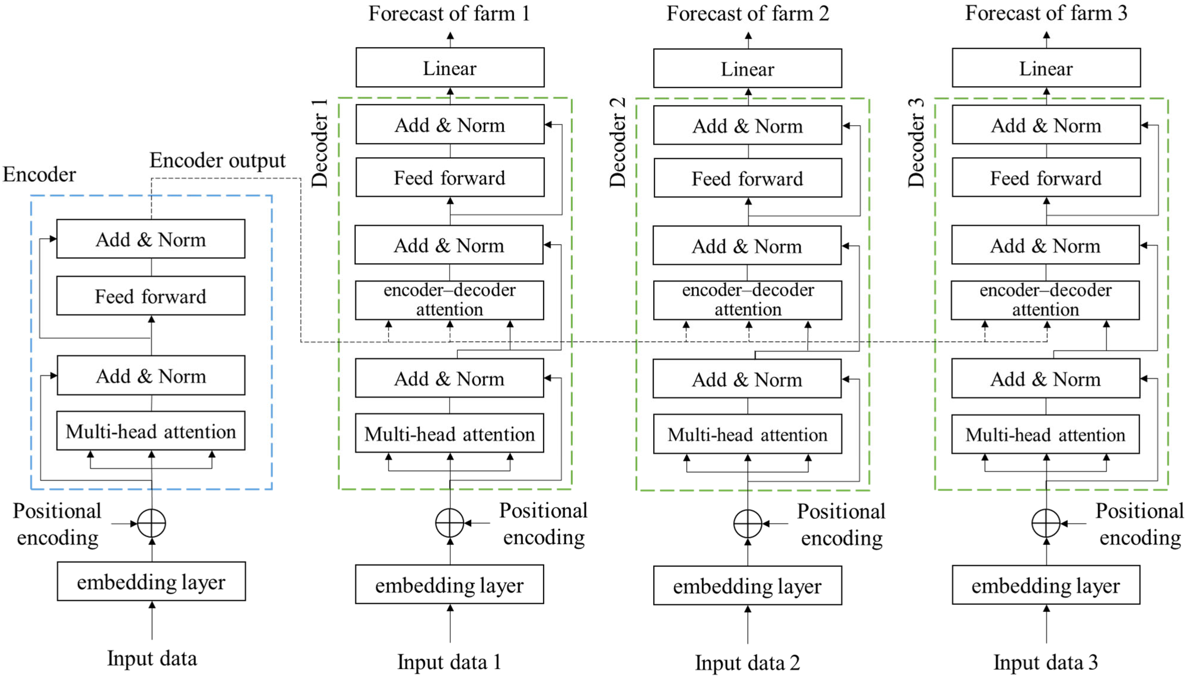 - We propose a multi-decoder, multitask learning model for short-term wind power forecasting, based on the Transformer architecture. The proposed model adopts a single-encoder–parallel-decoder structure, enabling joint forecasting of power outputs for multiple wind farms.