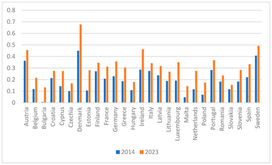Using the entropy method, it was possible to objectively determine the importance of explanatory variables, without relying on, for example, subjective expert opinions. The highest weight was assigned to the share of renewable energy sources and the lowest to greenhouse gas emissions. The resulting weights were then used in the next step to determine a synthetic measure of the progress of energy transformation in the EU-27 countries. When calculating the indicator, the data from the three explanatory variables were entered into the developed program. This allowed to construct a single measure that facilitates comparisons between countries, allows for the creation of country rankings, and for tracking changes in the indicator’s value over time. The indicator reached its highest value in 2014 for Denmark, 44%, followed by Sweden with 40%, and Austria, 36% (Figure 5). Bulgaria ranked last with an ETPI of less than 1%. Just ahead of Bulgaria were Malta and Poland, with ETPIs of 4% and 6%, respectively. This was mainly due to the low share of renewable energy sources in the energy mix and the low energy efficiency, as these explanatory variables received the highest weighting. In 2023, all countries improved their results. The highest increases were observed in Poland, Portugal, Malta and Estonia, where the increase was approximately twice. Bulgaria, on the other hand, achieved a record increase, with the index increasing almost 22 times. Despite this enormous progress, Bulgaria still ranks last in the ranking with an ETPI of 13%, but it no longer lags behind the other countries by such a significant margin. Malta is next in the ranking with an index of 14%, followed by Slovakia (15%), the Czech Republic (16%), Hungary (17%), and Poland (17%). In 2023, Denmark again achieved the highest rate, increasing it to 67%, followed by Sweden at 50%, Ireland at 46%, and Austria at 45%.