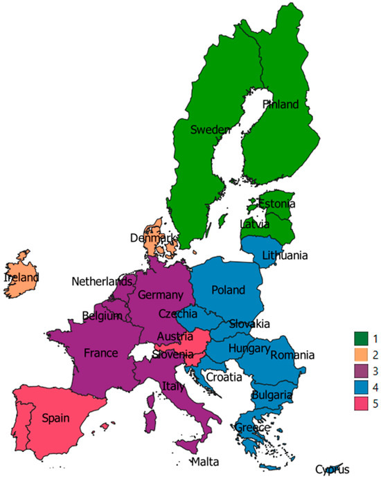 The year 2014 was the reference point for further analysis, that is, building clusters using statistical data from 2023. For 2023, the elbow method indicated that the countries should be divided into 5 groups, as presented in Figure 3. Therefore, it should be noted that the number of clusters decreased by approximately 30%.