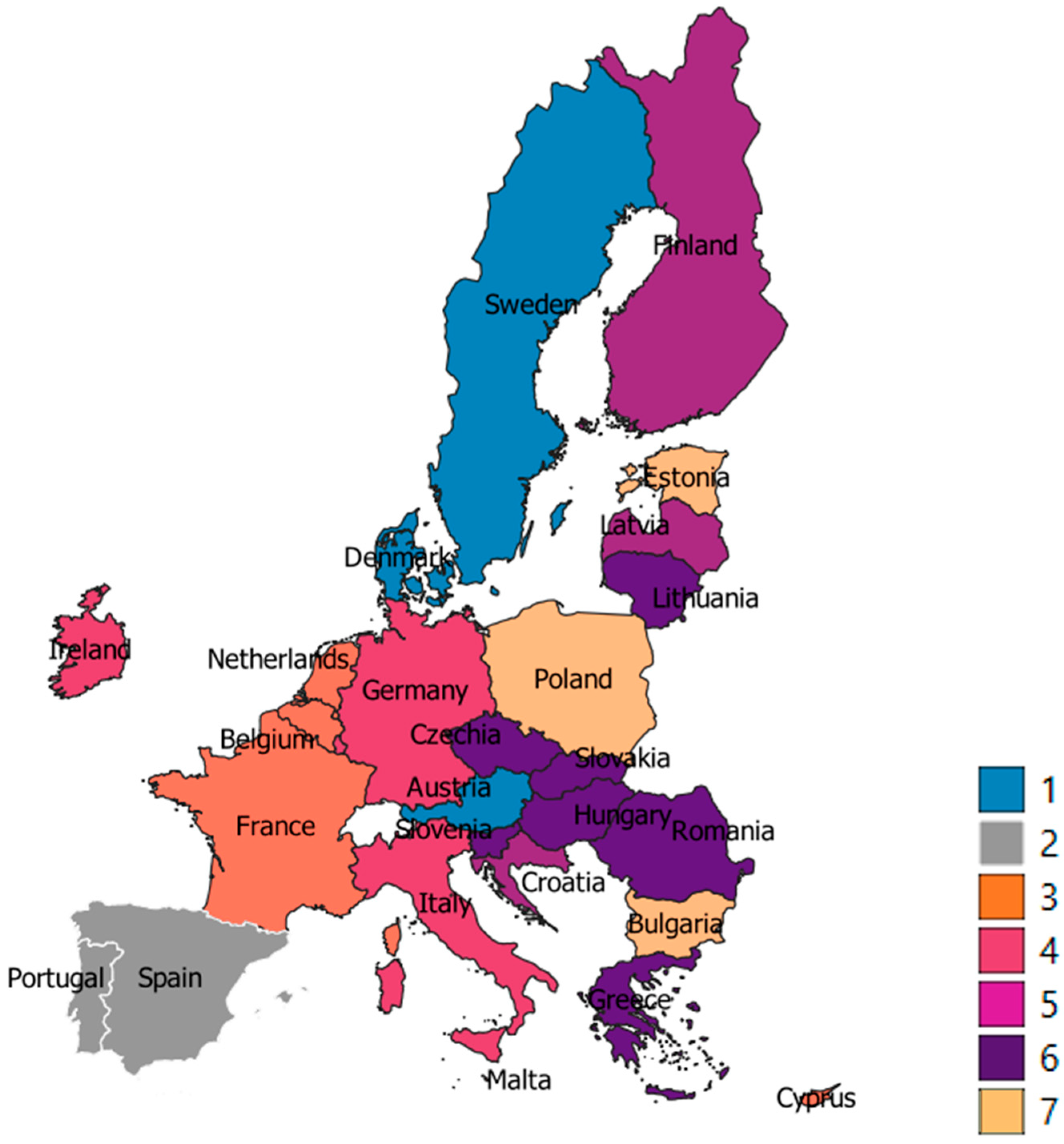 Cluster 1: Sweden, Finland, Denmark, Austria.