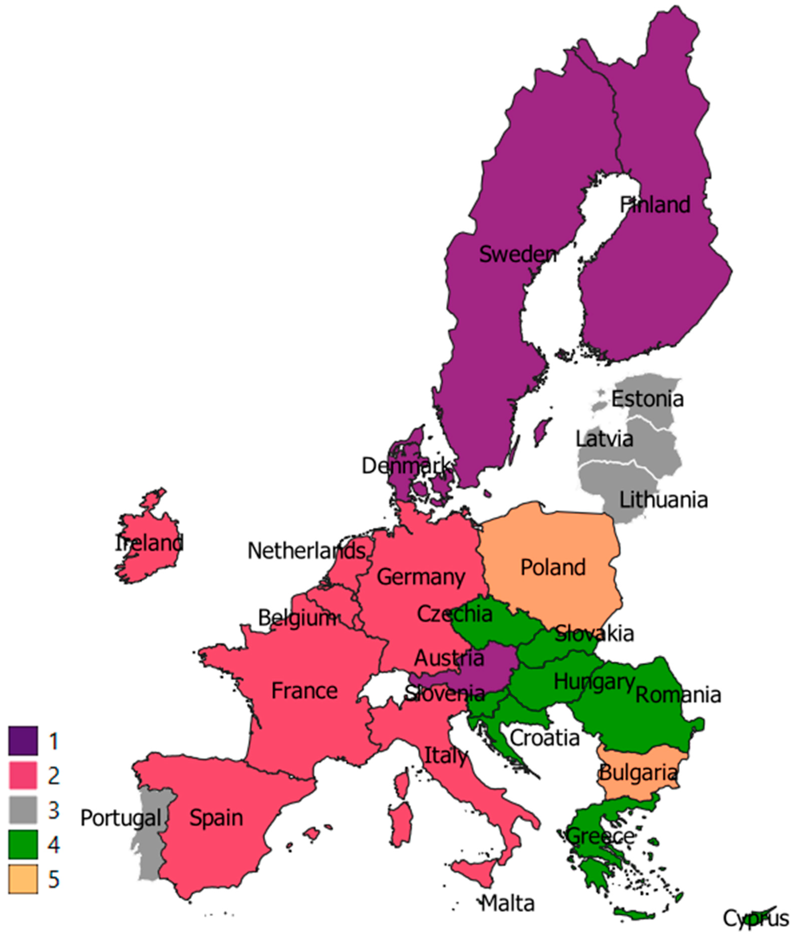 Cluster 3: Germany, Italy, Malta, France, Belgium, Netherlands, Luxembourg.