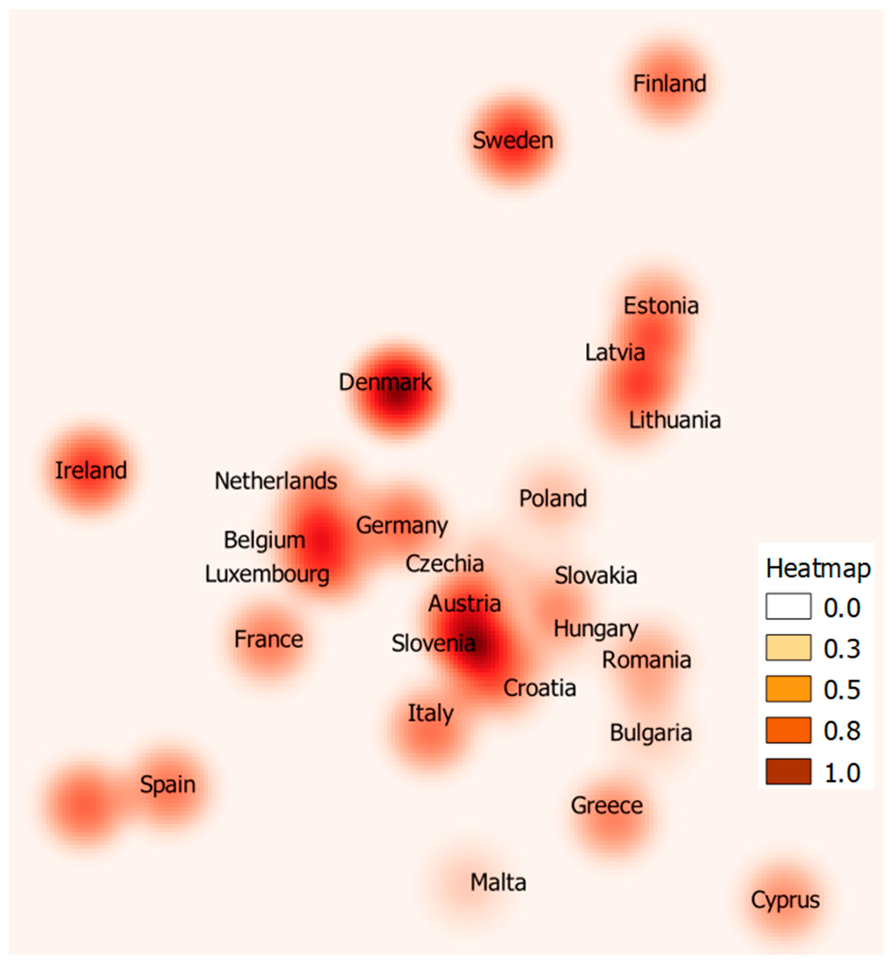 Figure 6). The map was created using kernel density estimation. A raster was created with each pixel determined in density. A Gaussian function was used to determine the influence of a given point on the density of the pixels. For each pixel, the influences of all points within a defined radius were summed. Hotspots are points with high point density. The points were assigned weights from the ETPI attribute, allowing them to be taken into account when calculating the density. The darker the color, the larger the cluster of countries with high scores; the lighter the color, the lower the score. A distinct cluster of countries marked in dark red can be observed in the case of Scandinavian countries that are leading the energy transition. Another concentration of countries with high ETPI values appears in Austria, Slovenia, and Croatia. Lithuania, Latvia, and Estonia form a separate hotspot, indicating a dynamic improvement in the progress of the transition in this region. Meanwhile, the countries of Central and Eastern Europe are located in the lighter-colored area, indicating a lack of strong clusters of transformation leaders.
