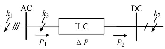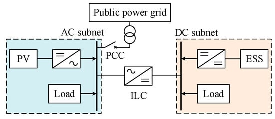 A typical topology of a flexible AC/DC hybrid microgrid is shown in Figure 1, which mainly consists of an AC sub-microgrid, a DC sub-microgrid, and an interlinking converter (ILC). In this case, AC and DC sub-grids are integrated, combining the advantages of both AC and DC microgrids: firstly, it may eliminate unnecessary intermediate AC/DC power conversion, thereby improving total efficiency; secondly, the energy from different sub-grids serve as backup to each other, enhancing the reliability of the hybrid microgrid. Therefore, it will play a key role in the development of future active grids [4,5,6,7].
