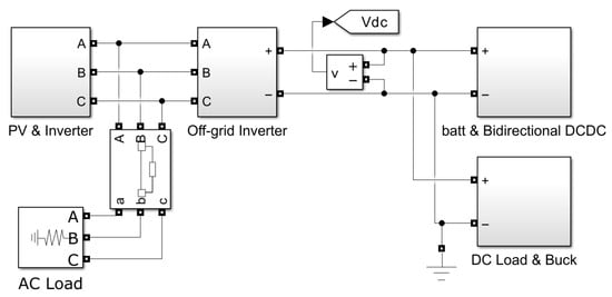 In this example, the AC microgrid includes a photovoltaic system and AC loads. The photovoltaic cells are connected in parallel to the 380 V AC bus through a three-phase inverter, while the AC loads are directly connected in parallel to the AC bus. The DC microgrid includes an energy storage system and DC loads. The battery is connected in parallel to the DC bus through a bidirectional DC/DC converter, and the DC load is connected in parallel to the DC bus through a Buck circuit. The AC bus and the DC bus are interconnected via an interconnection converter.