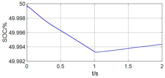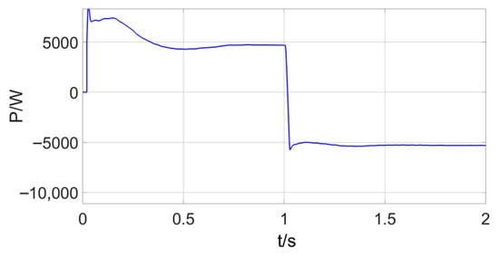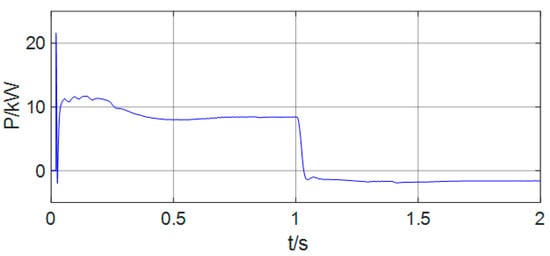 The power direction of the interconnection converter is defined as flowing from the DC bus to the AC bus, meaning the inverter state is positive, and negative otherwise. When setting 1 s, the AC load is disconnected, as illustrated in Figure 7, Figure 8 and Figure 9. At this point, energy storage switches from discharge to charge, and the interconnection converter transitions from inverter to rectifier mode.
