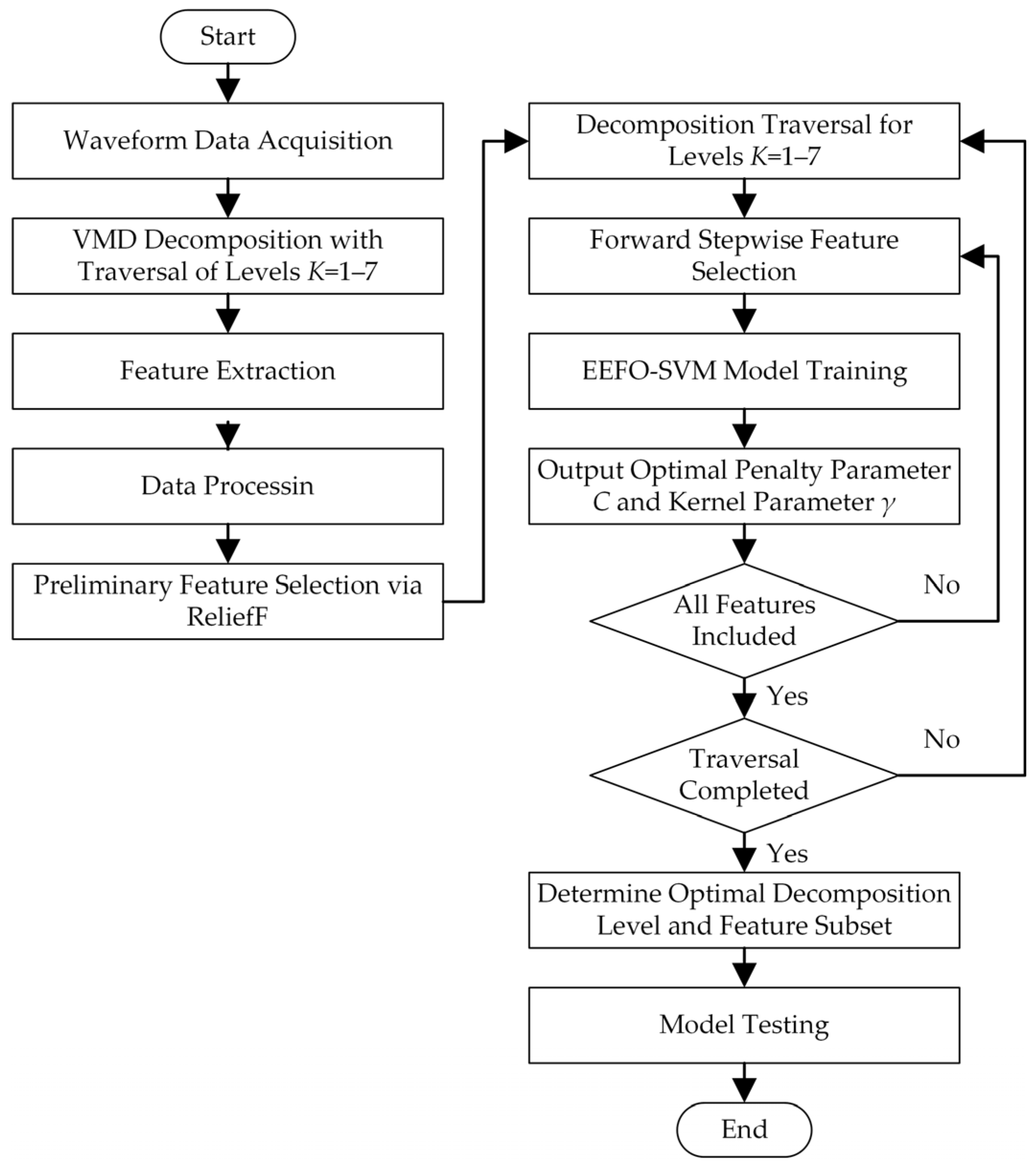 Step 2: VMD Decomposition and Mode Number Optimization—All acquired waveforms are subjected to Variational Mode Decomposition. The decomposition level K is varied from 1 to 7, and the optimal number of modes is dynamically determined based on subsequent classification performance.