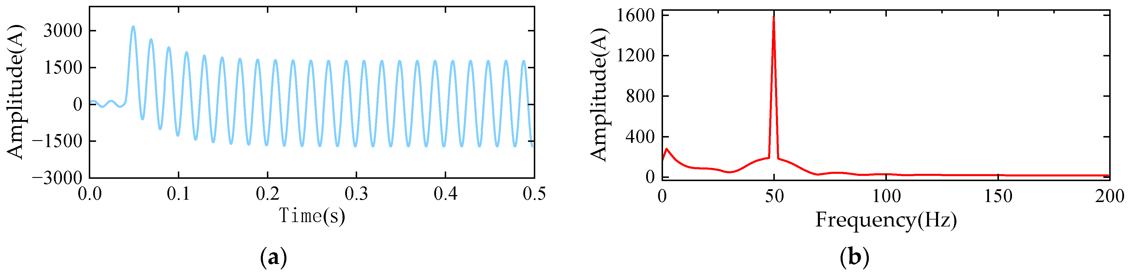 Figure 7b), the 50 Hz fundamental component overwhelmingly dominates, with its magnitude far exceeding all other frequency components. The amplitudes of higher-order harmonics are minimal and essentially negligible. This indicates that after the brief transient period, the fault current quickly converges to an almost pure power-frequency sinusoidal wave. The small-magnitude peak near 0 Hz corresponds to the rapidly decaying transient DC offset observed in the time domain. Overall, the amplitude spectrum confirms two key signatures of the fault current: (1) a short-duration high-magnitude impulse with a DC offset exists at the initial stage due to transient superposition, and (2) after a brief transient decay, the current rapidly settles into a steady-state condition dominated by the 50 Hz fundamental, with no significant higher-order harmonic interference.