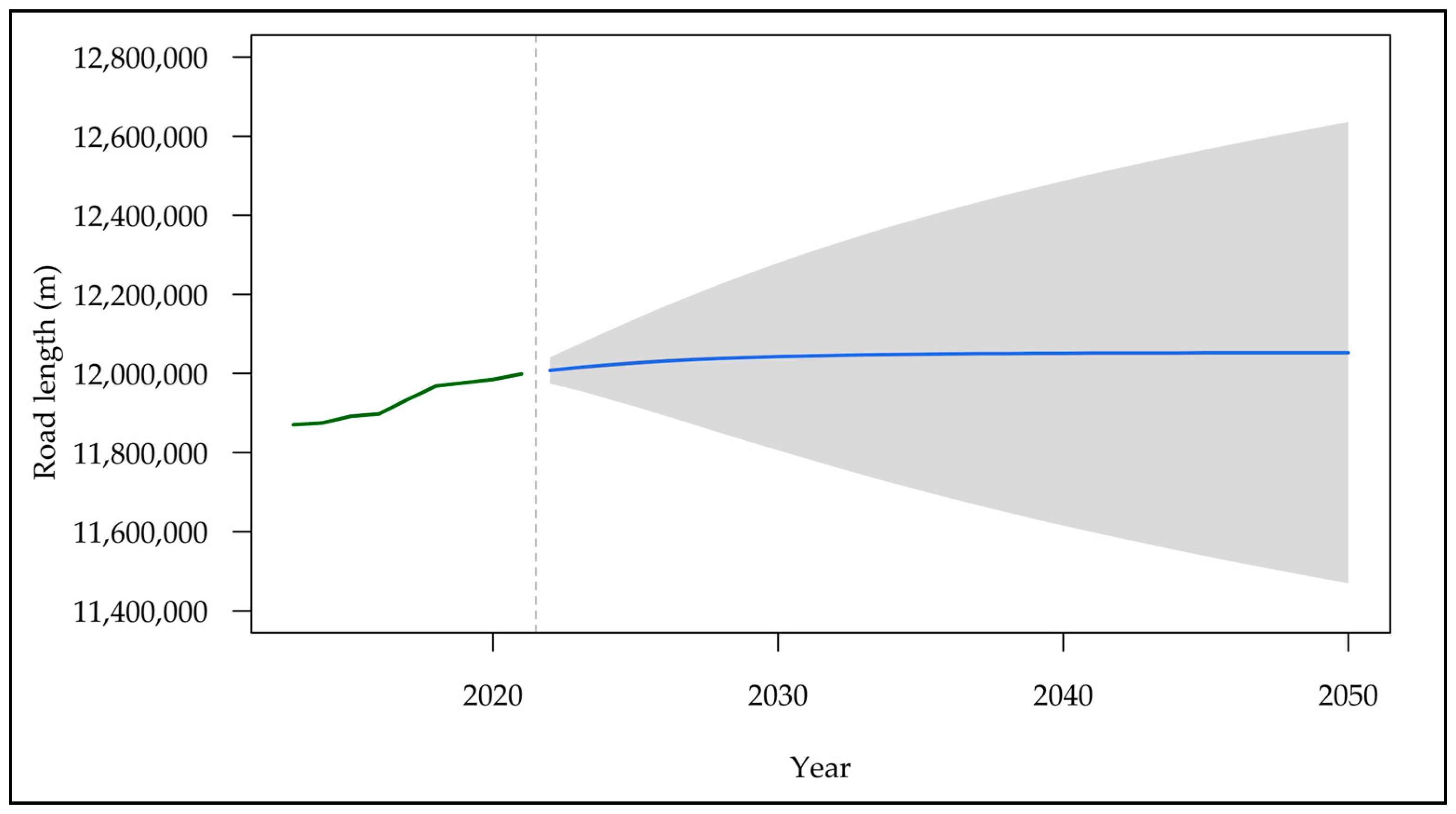 - Time series models were used to predict socioeconomic variables (Employment, road length and vehicle stock).