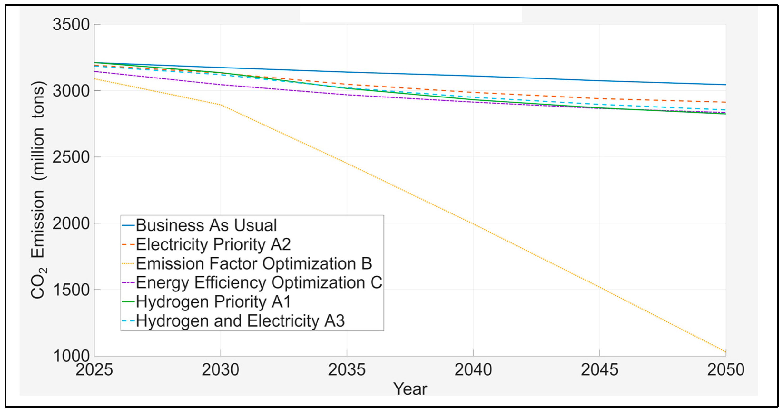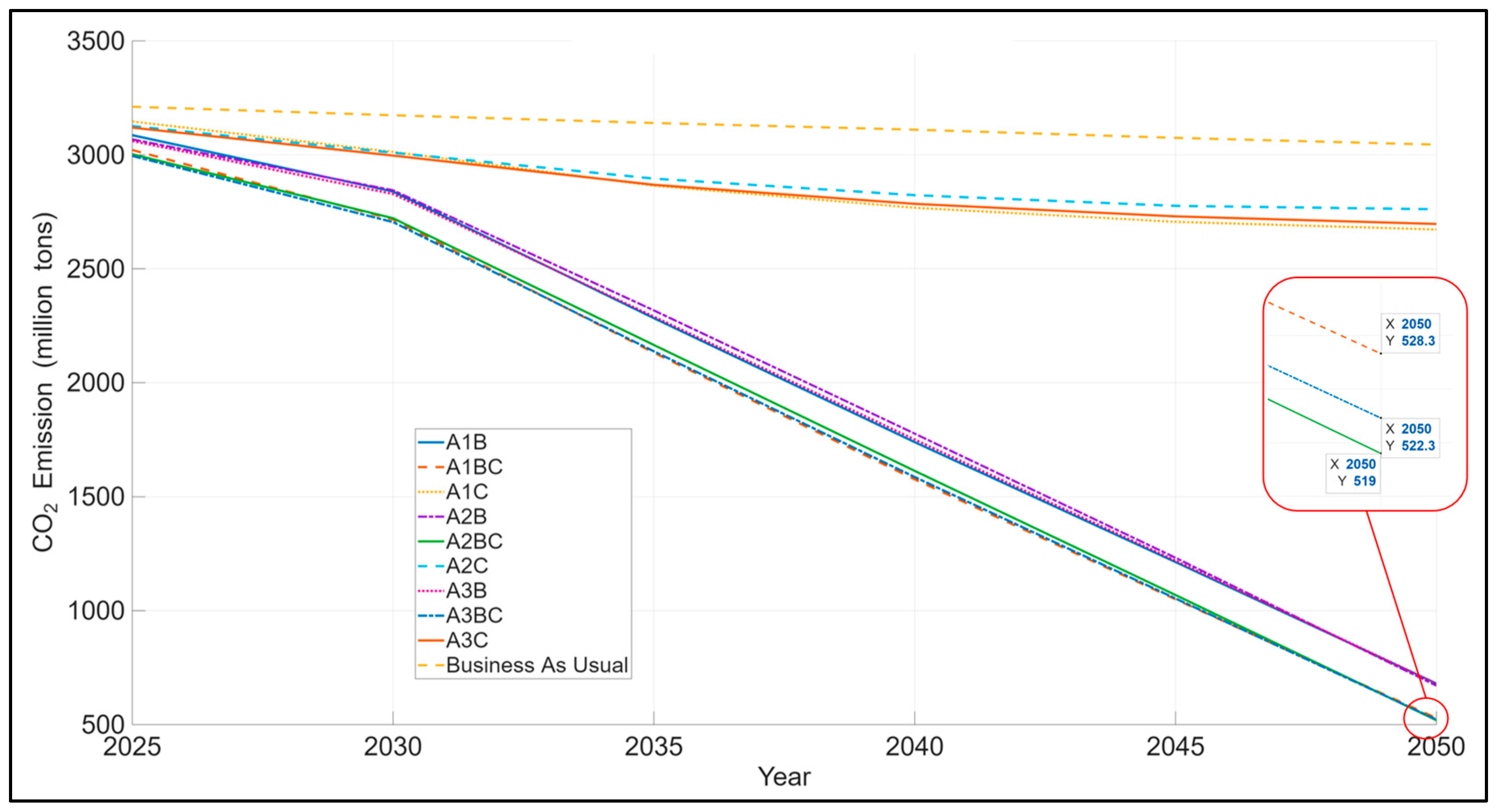 | Scenarios | Emissions in 2050 (kt CO2) | Cumulative Emissions (kt CO2) | 2050 Emission Reduction Ratio (VS BAU) (%) | Cumulative Emission Reduction Ratio (VS BAU) (%) |