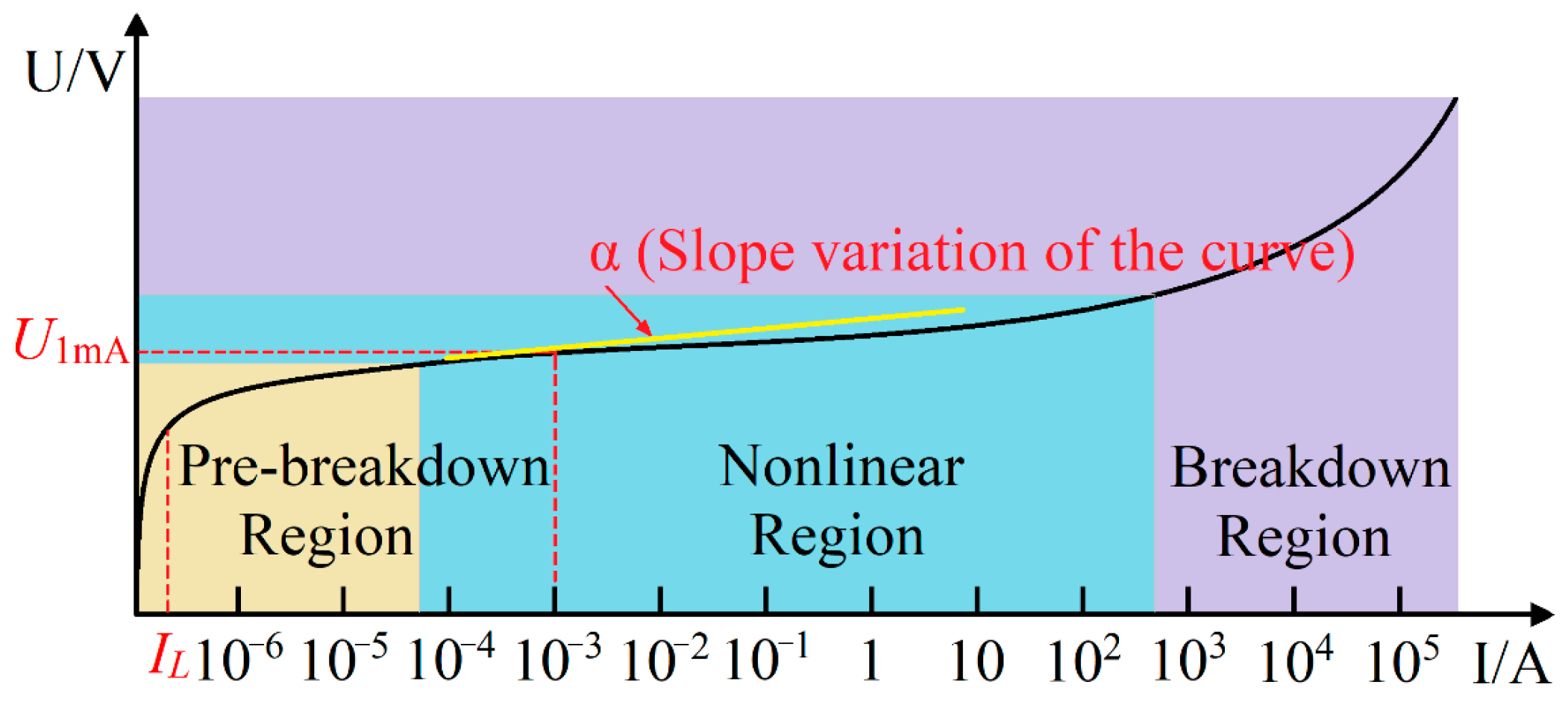 - Zhou, Q.; Shen, J.; Xiao, Y.; Huang, X.; Cao, T. Withstanding Capability and Aging Mechanism of Metal-Oxide Varistors Under DC Temporary Overvoltage. Electr. Power Syst. Res. 2024, 227, 109982. [Google Scholar] [CrossRef]