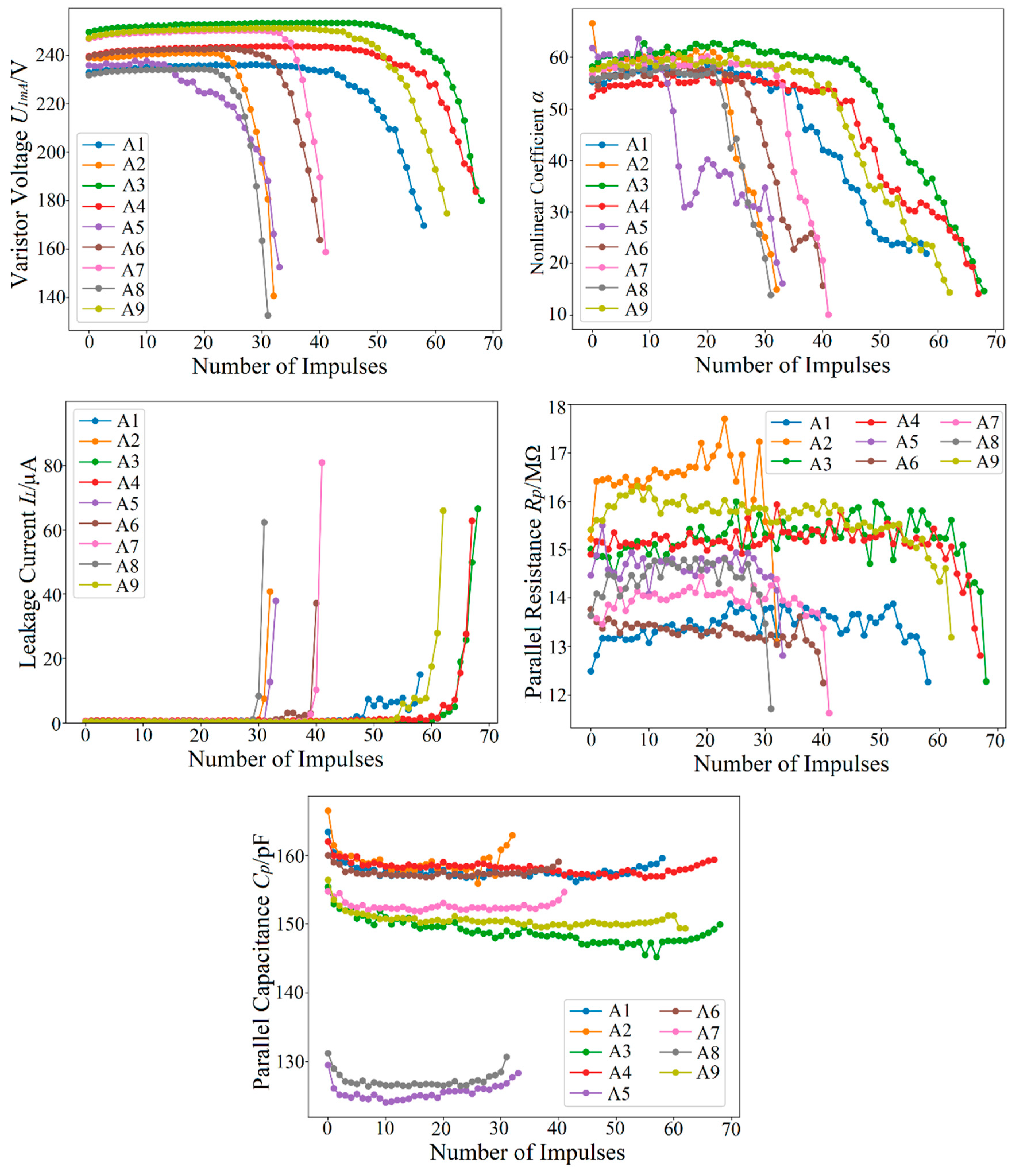- A comprehensive full-lifecycle dataset is constructed and the deterioration evolution laws are clarified. By designing an 8/20 μs impulse current accelerated deterioration experiment, 441 sets of valid data covering nine same-batch 07D241K ZnO varistors from initial state to complete failure are collected, effectively addressing the problem of incomplete dataset coverage in existing studies. The analysis of the experimental results reveals the intrinsic deterioration laws of the core parameters: varistor voltage () exhibits a three-stage characteristic of “slow increase–stabilization–rapid decrease”; nonlinear coefficient () attenuates by ~56% throughout the deterioration process; leakage current () remains stable in most stages but shows a “steep rise” near failure; parallel resistance () and parallel capacitance () change regularly with the evolution of the grain boundary layer defects ( first increases then decreases, first decreases then stabilizes and increases). Additionally, obvious individual differences in parameter changes among same-batch samples further confirm the necessity of multi-parameter fusion characterization.