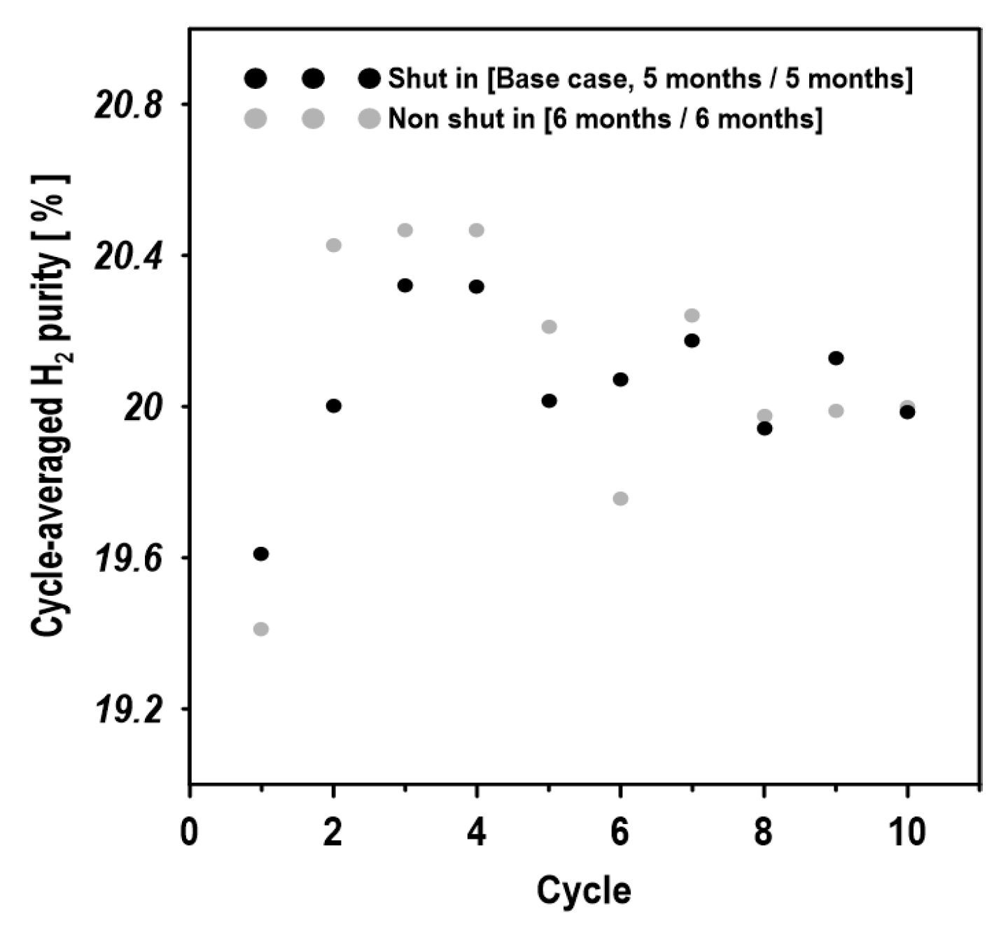 - This study is limited by the use of a homogeneous grid and simplified fluid properties, which do not represent geological heterogeneity, stratification, pore-connectivity variations, or reactive processes. Future work will develop a more detailed model that incorporates these factors and apply the proposed operating strategies to a field-scale model calibrated with actual reservoir properties. This will allow for quantitative validation under realistic conditions and support the development of practical guidelines for hydrogen-enriched methane storage in depleted gas reservoirs.