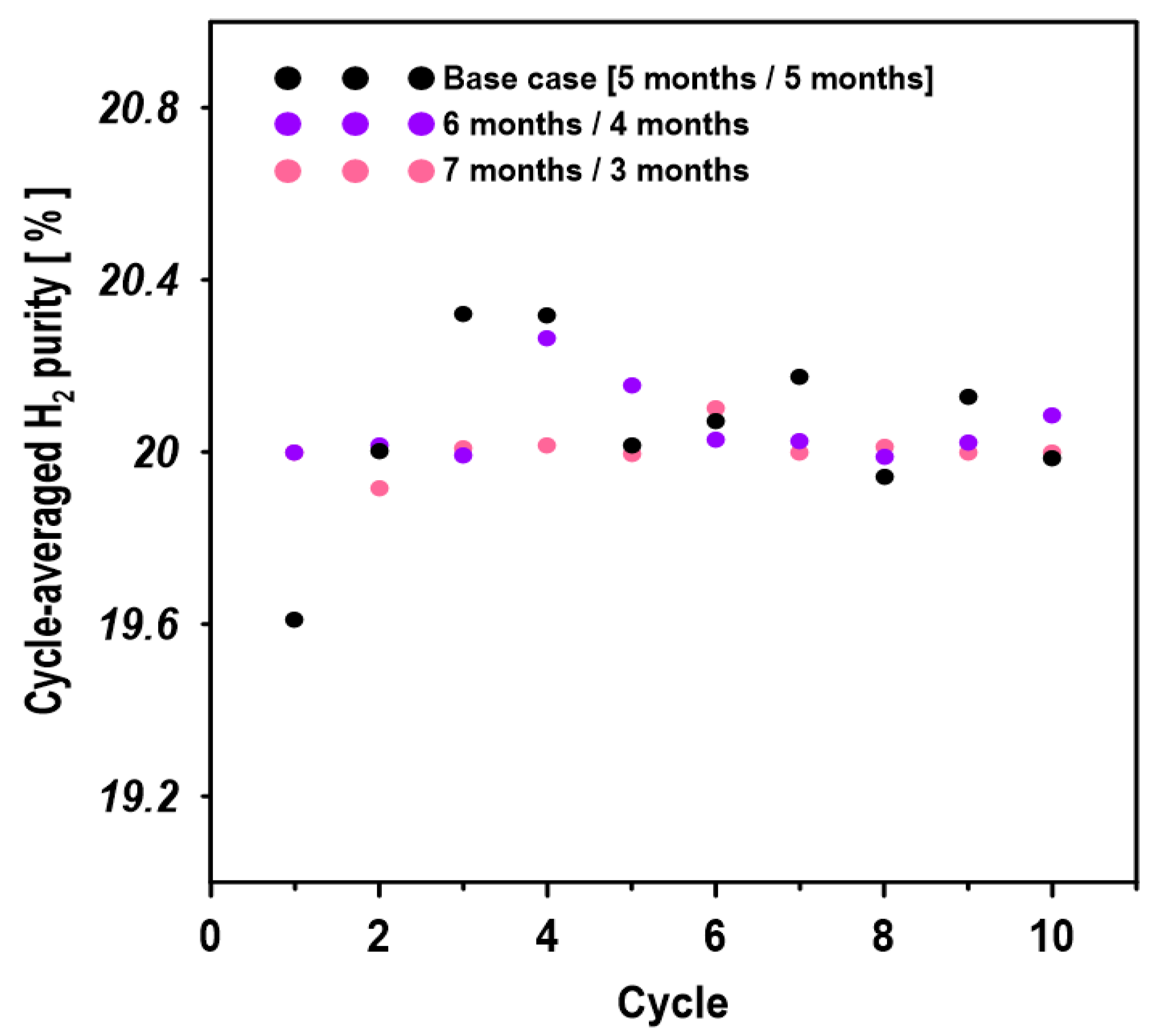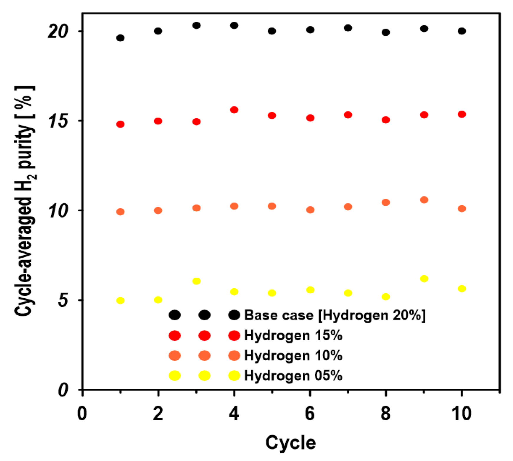 - Hydrogen blending ratio remained the most influential factor governing produced-gas purity. The 15% and 20% blending cases consistently produced the highest hydrogen purity, stabilizing near 15.6% and 19.9–20.0%, respectively, while forming the smallest long-term mixing zones. Lower blending ratios of 5–10% significantly reduced nitrogen co-production, reaching nitrogen recoveries as low as 0.97–1.08%, but resulted in much lower hydrogen purity corresponding to the injected composition.