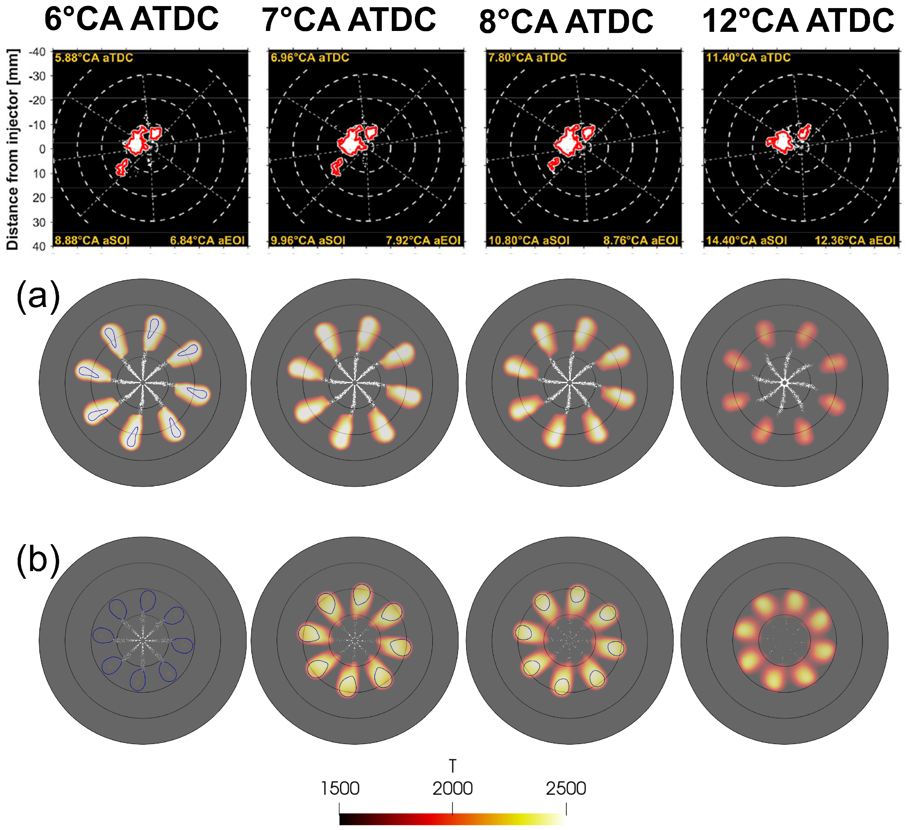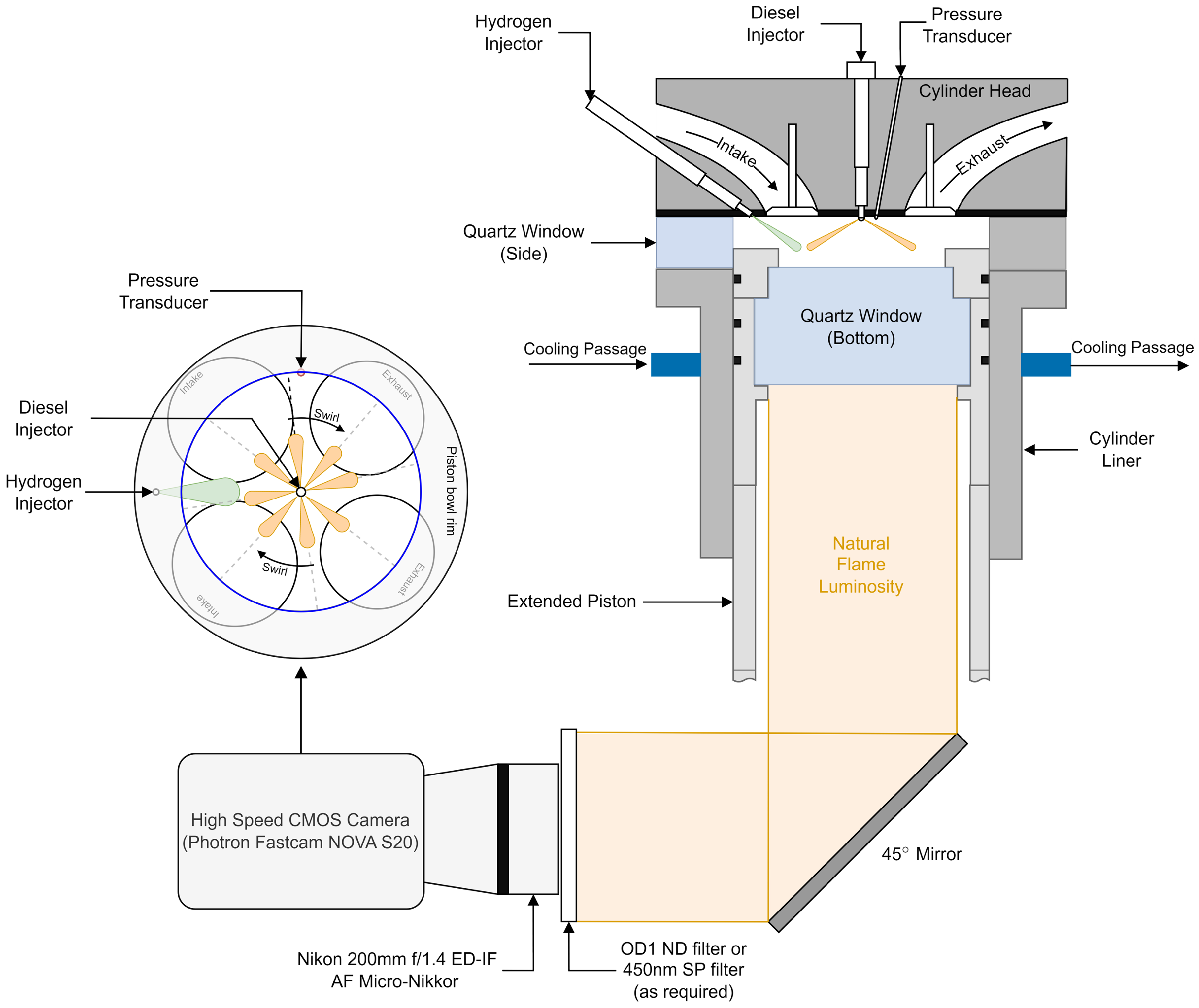 - Heaton, A.G.; Chan, Q.N.; Kook, S. The influence of hydrogen injection timing and energy proportion on flame developments in a dual direct injection optical diesel engine. Appl. Energy Combust. Sci. 2025, 24, 100382. [Google Scholar] [CrossRef]